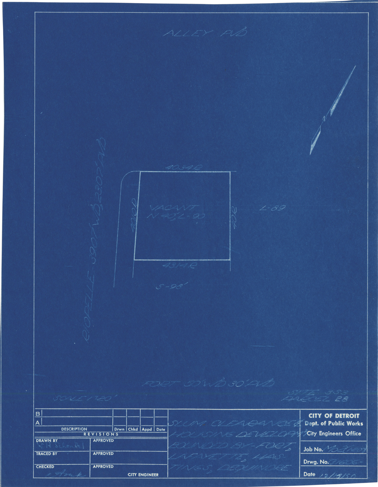 Part of a collection that contains condemnation files, photographs, blueprints and descriptions of slum clearance housing parcels for the City of Detroit. Of particular note are areas which included the neighborhoods known as Paradise Valley, Black Bottom, Corktown and the Jeffries Housing Project.