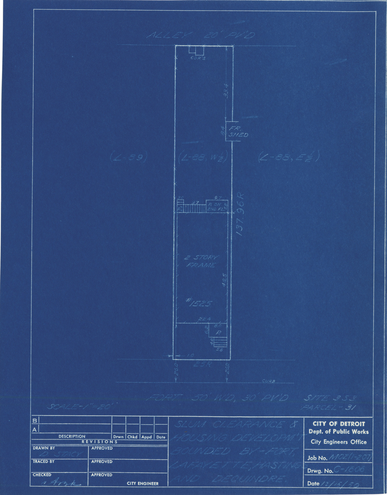 Plot plan for property located on Fort, parcel 31, site 3-S-3. Recorded on blueprint: "Slum clearance & housing developm't bounded by Fort, Lafayette, Hastings and Dequindre."
