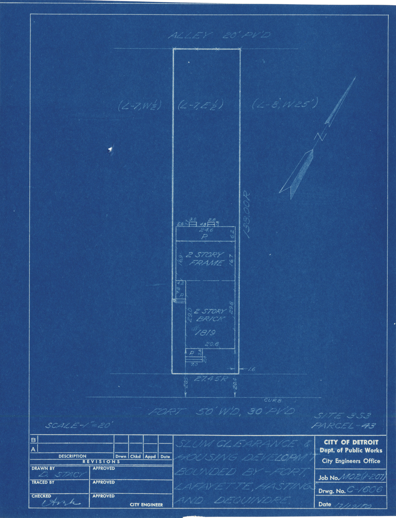 Plot plan for property located on Fort, parcel 43, site 3-S-3. Recorded on blueprint: "Slum clearance & housing developm't bounded by Fort, Lafayette, Hastings and Dequindre."