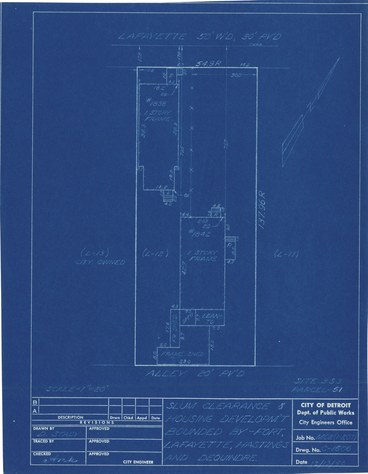 Plot plan for property located on Lafayette, parcel 51, site 3-S-3. Recorded on blueprint: "Slum clearance & housing developm't bounded by Fort, Lafayette, Hastings and Dequindre."