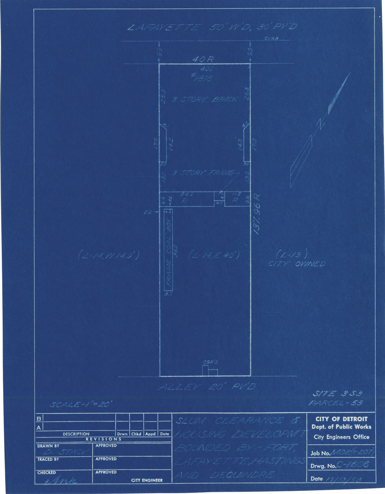 Plot plan for property located on Lafayette, parcel 53, site 3-S-3. Recorded on blueprint: "Slum clearance & housing developm't bounded by Fort, Lafayette, Hastings and Dequindre."
