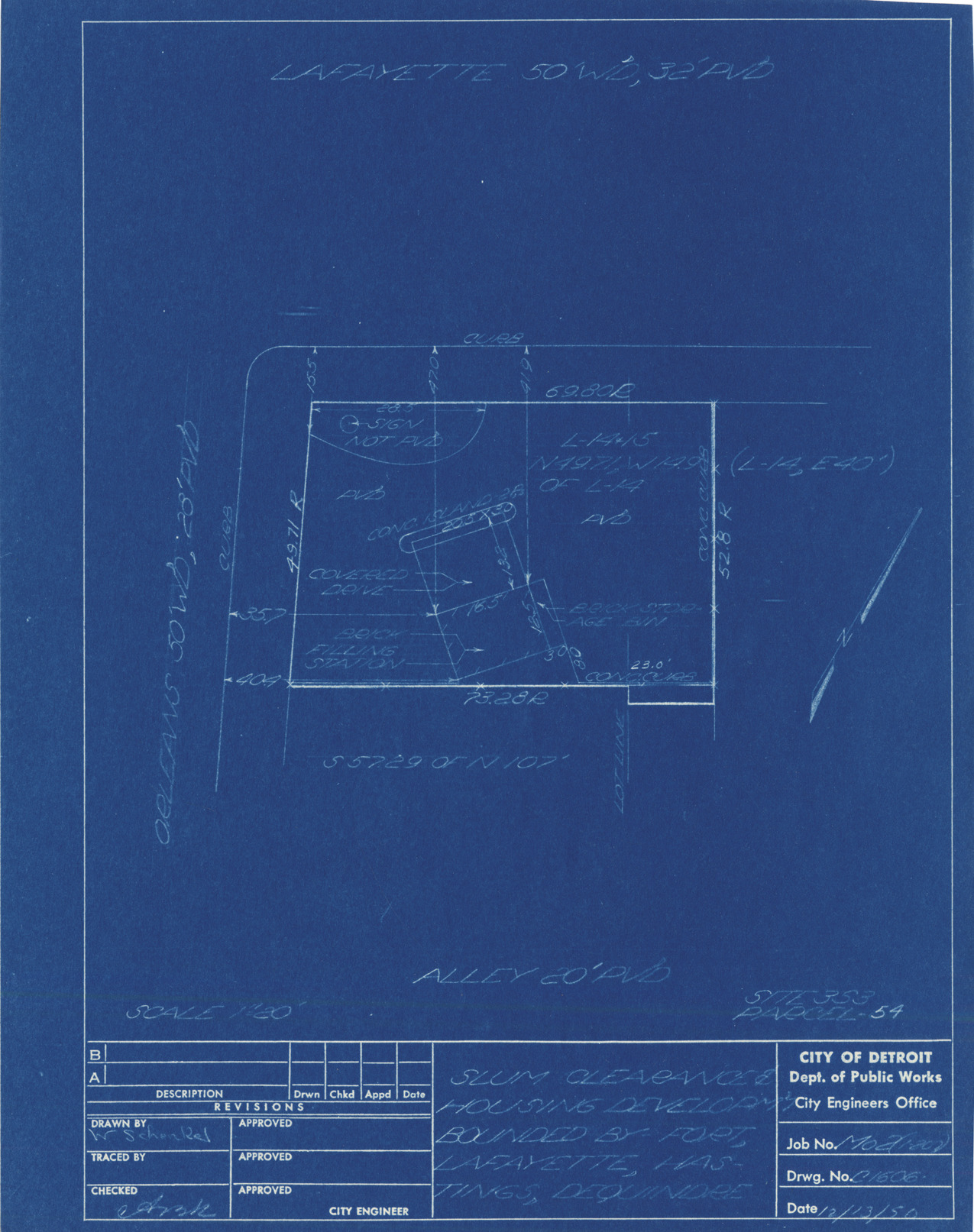 Plot plan for property located on the corner of Lafayette and Orleans, parcel 54, site 3-S-3. Recorded on blueprint: "Slum clearance & housing developm't bounded by Fort, Lafayette, Hastings, Dequindre."