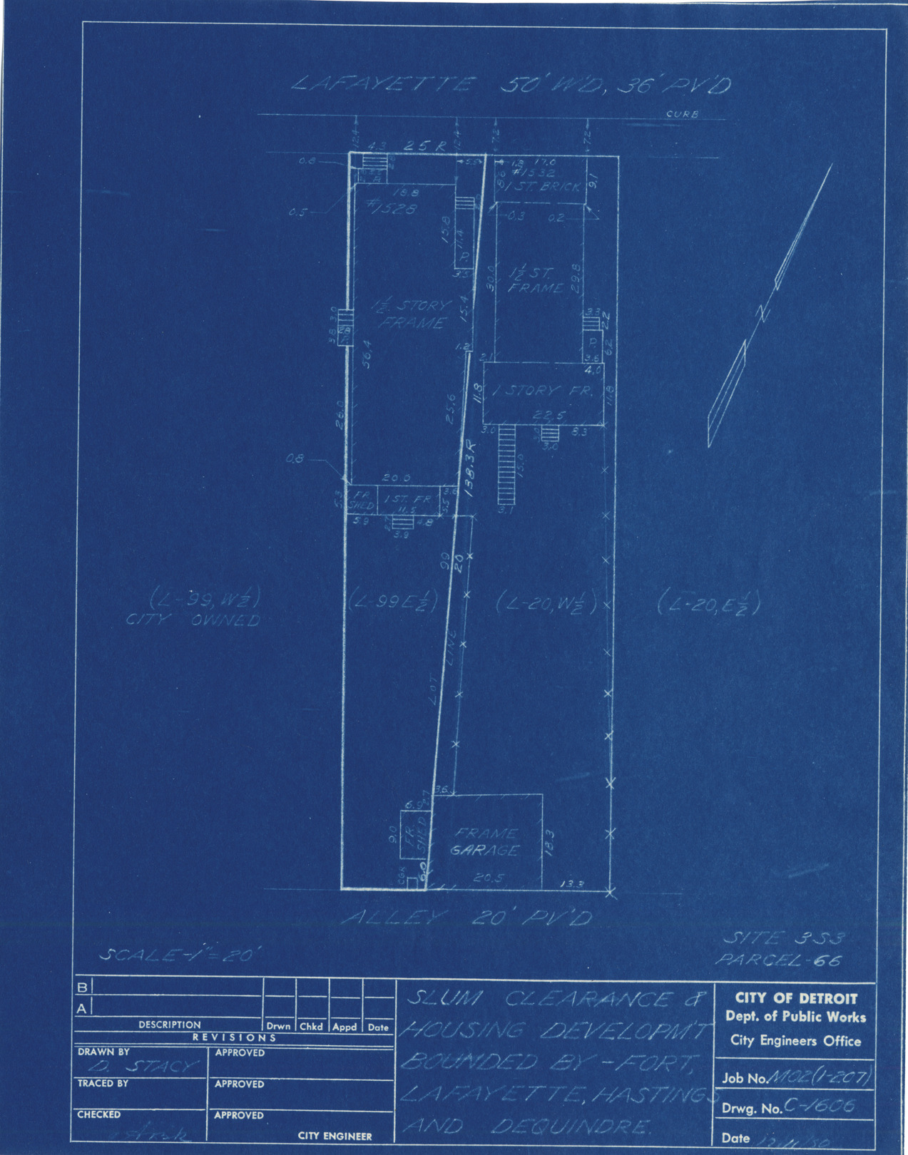 Plot plan for property located on Lafayette, parcel 66, site 3-S-3. Recorded on blueprint: "Slum clearance & housing developm't bounded by Fort, Lafayette, Hastings and Dequindre."