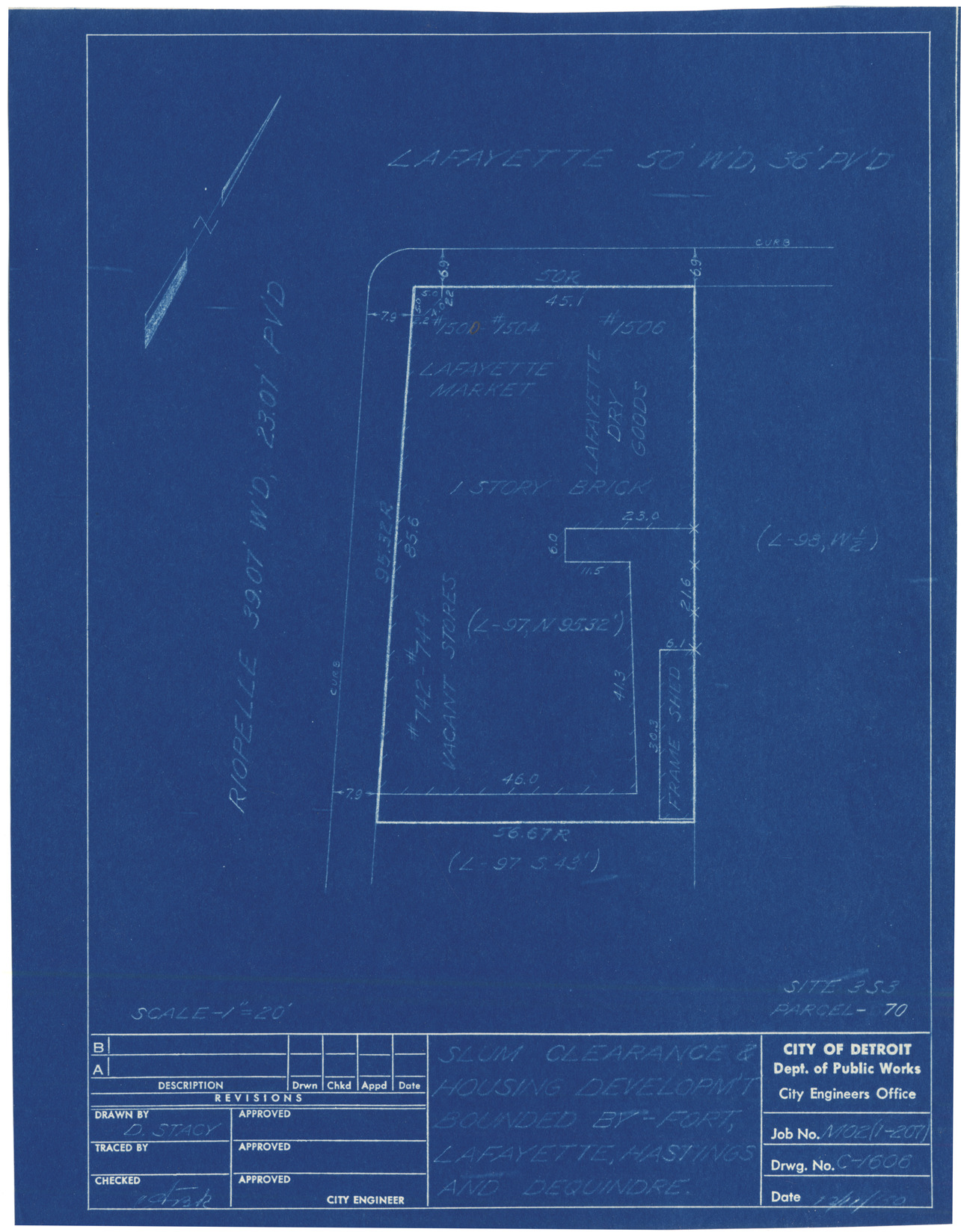 Plot plan for property located on the corner of Lafayette and Riopelle, parcel 70, site 3-S-3. Recorded on blueprint: "Slum clearance & housing developm't bounded by Fort, Lafayette, Hastings and Dequindre."