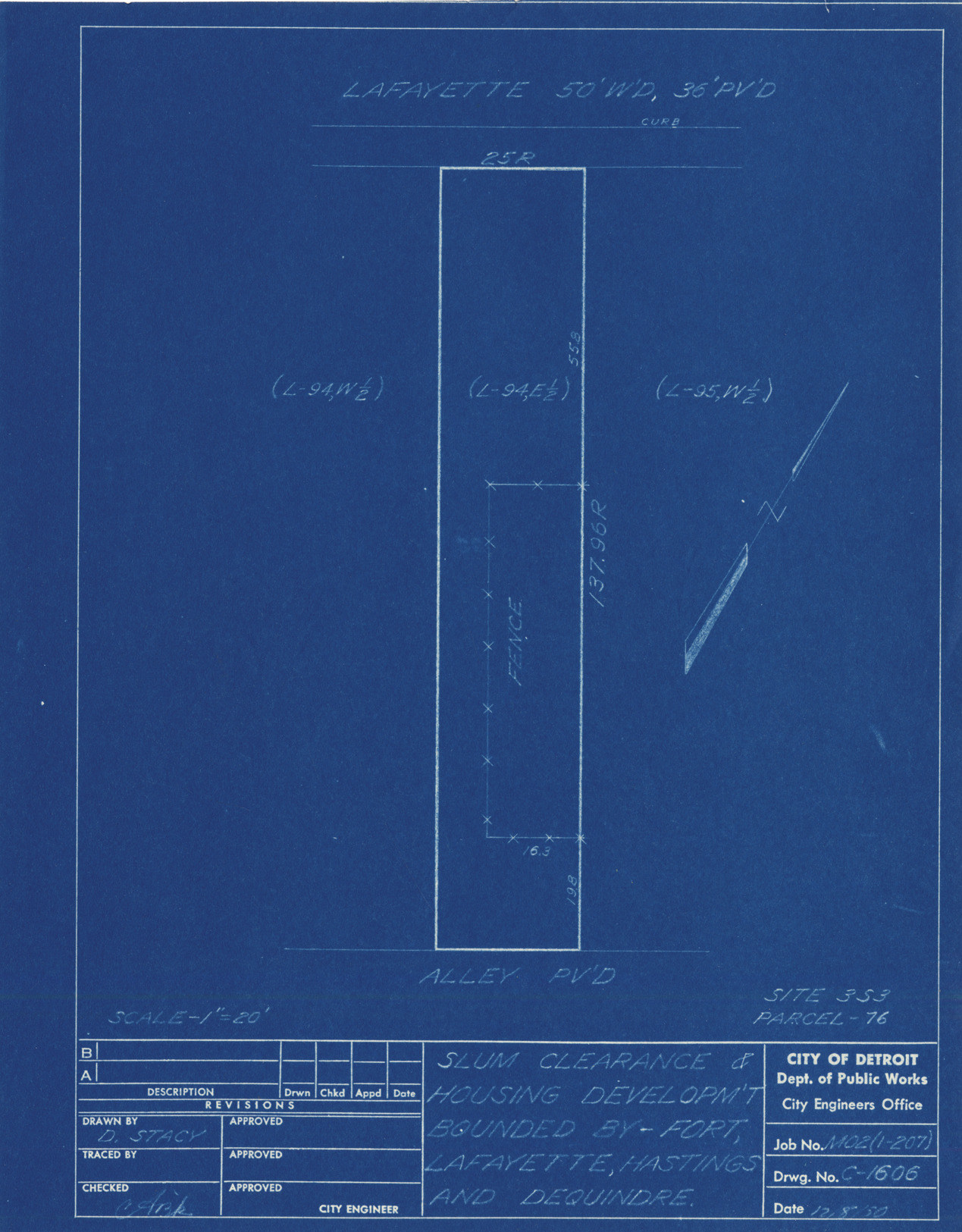Plot plan for property located on Lafayette, parcel 76, site 3-S-3. Recorded on blueprint: "Slum clearance & housing developm't bounded by Fort, Lafayette, Hastings and Dequindre."