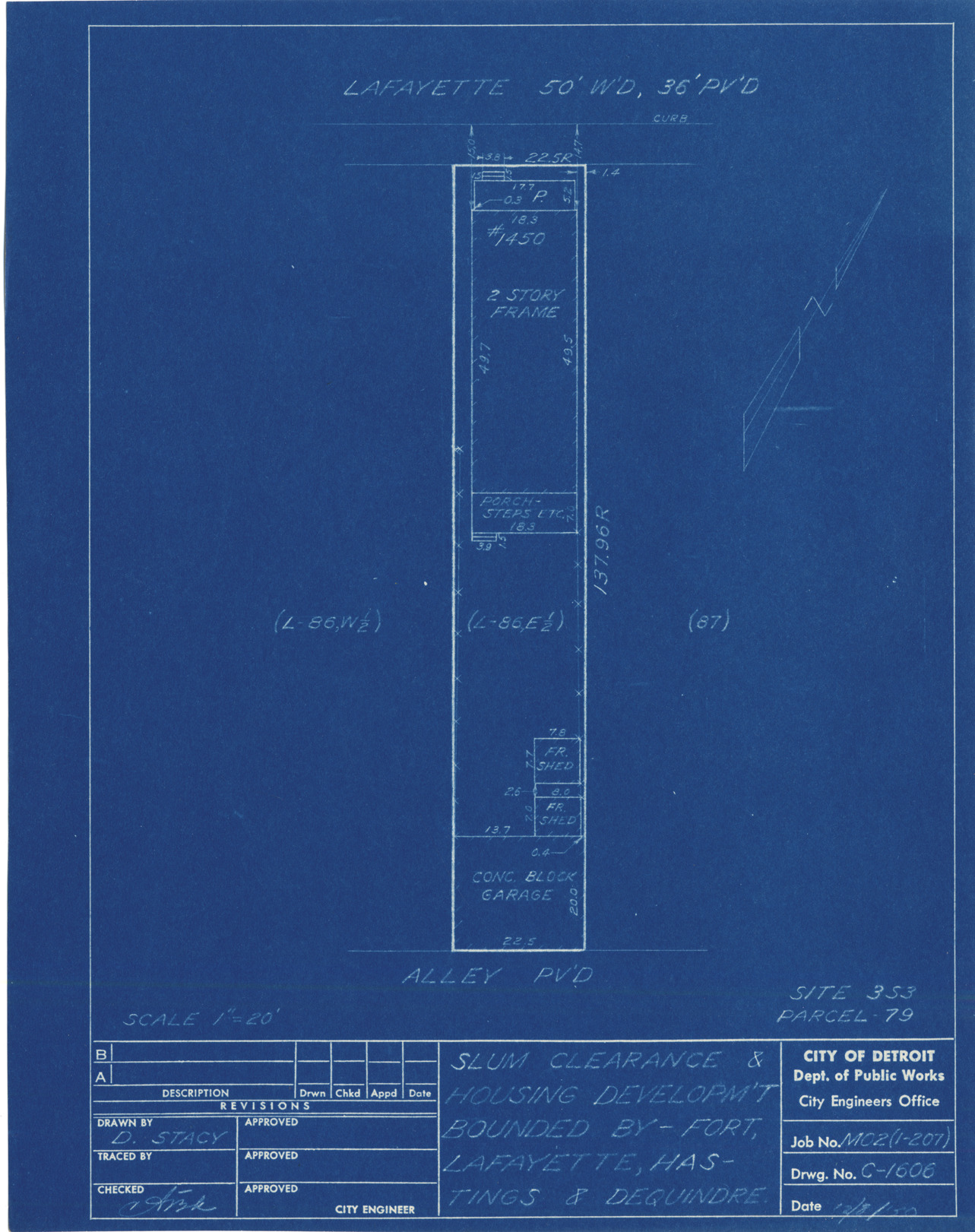 Plot plan for property located on Lafayette, parcel 79, site 3-S-3. Recorded on blueprint: "Slum clearance & housing developm't bounded by Fort, Lafayette, Hastings & Dequindre."
