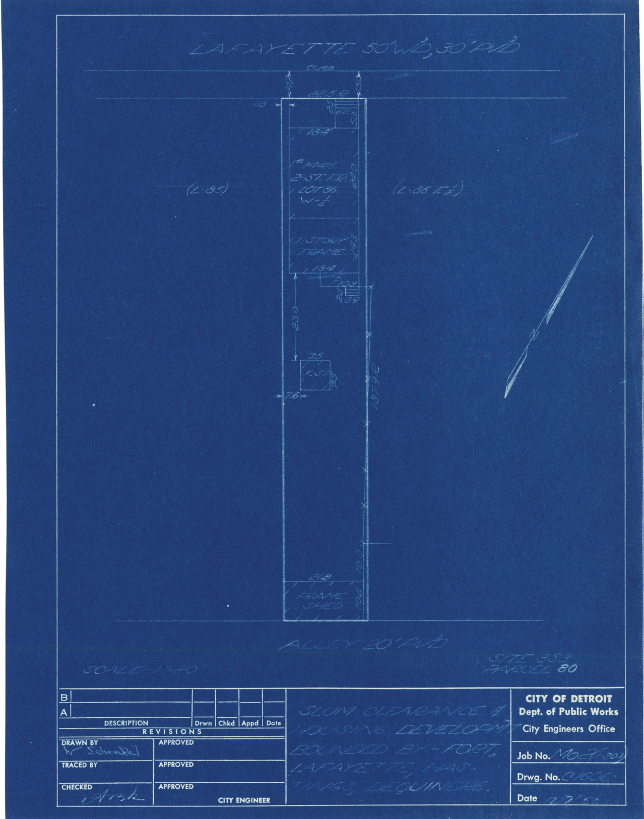 Plot plan for property located on Lafayette, parcel 79, site 3-S-3. Recorded on blueprint: "Slum clearance & housing developm't bounded by Fort, Lafayette, Hastings, Dequindre."