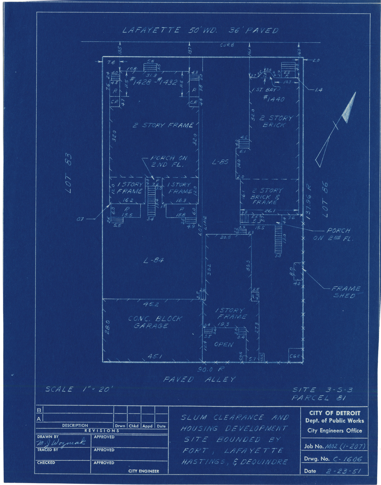 Plot plan for property located on Lafayette, parcel 81, site 3-S-3. Recorded on blueprint: "Slum clearance and housing development bounded by Fort, Lafayette, Hastings & Dequindre."