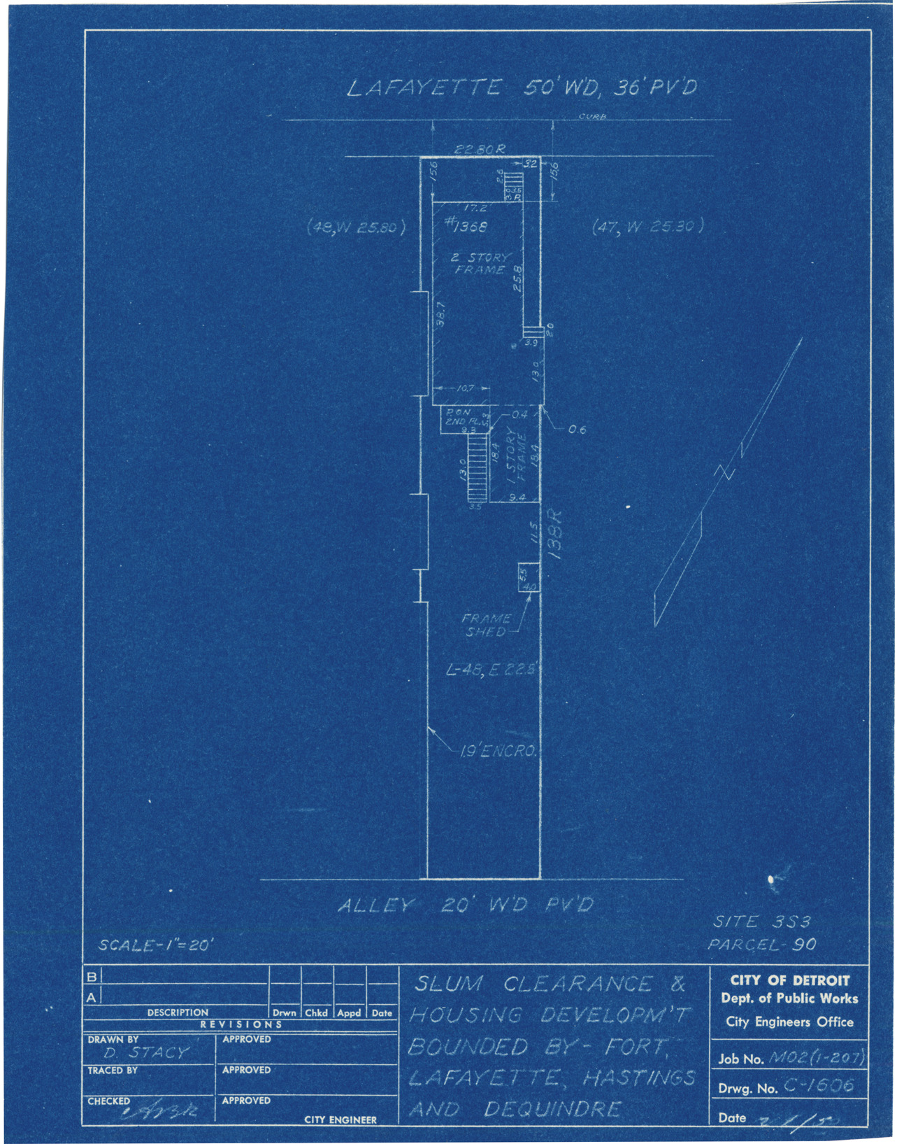 Plot plan for property located on Lafayette, parcel 90, site 3-S-3. Recorded on blueprint: "Slum clearance & housing developm't bounded by Fort, Lafayette, Hastings and Dequindre."