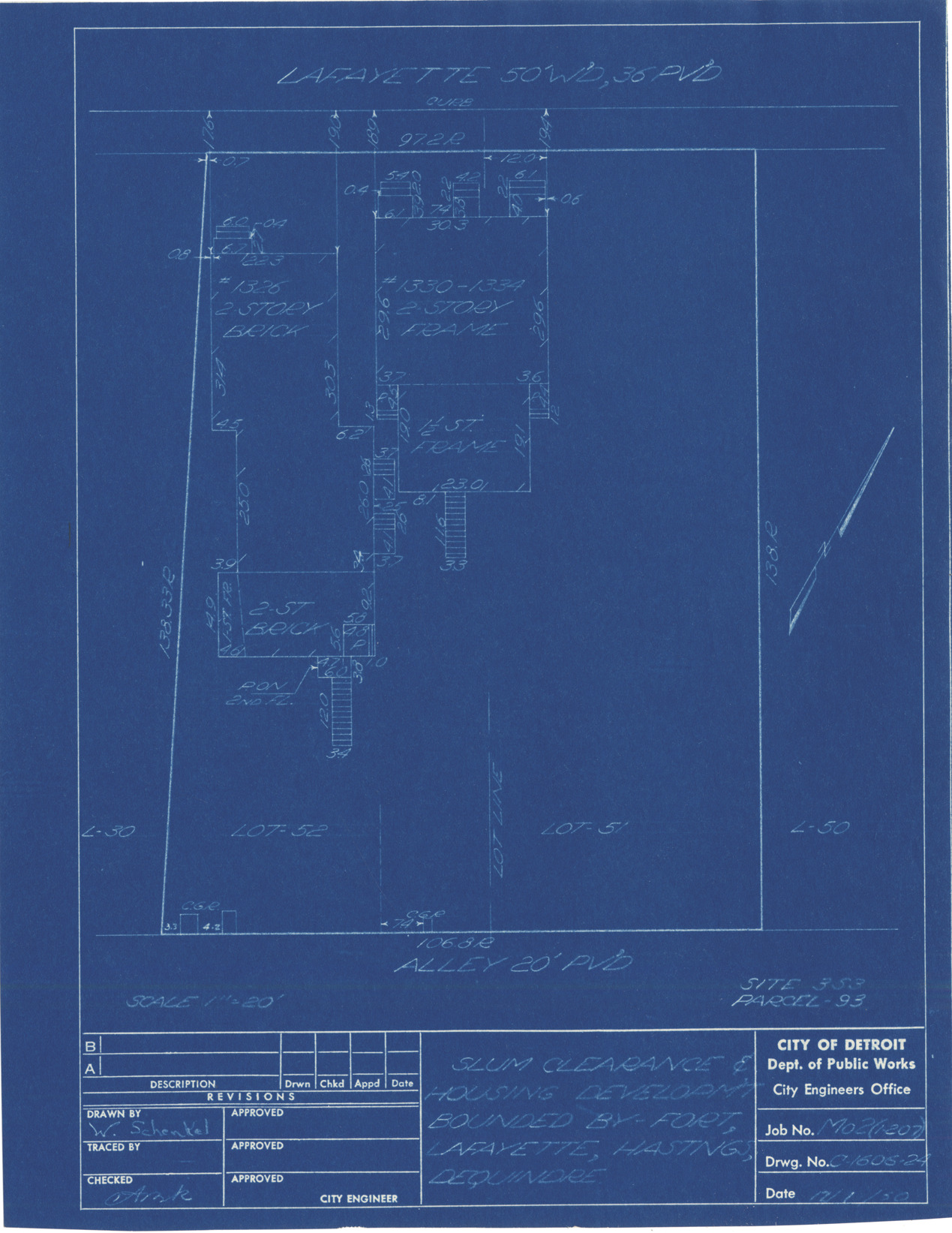 Plot plan for property located on Lafayette, parcel 93, site 3-S-3. Recorded on blueprint: "Slum clearance & housing developm't bounded by Fort, Lafayette, Hastings, Dequindre."