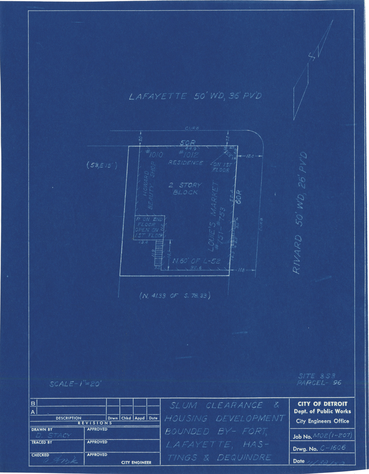 Plot plan for property located on the corner of Lafayette and Rivard, parcel 96, site 3-S-3. Written on blueprint: "Louie's Market." Recorded on blueprint: "Slum clearance & housing developm't bounded by Fort, Lafayette, Hastings & Dequindre."