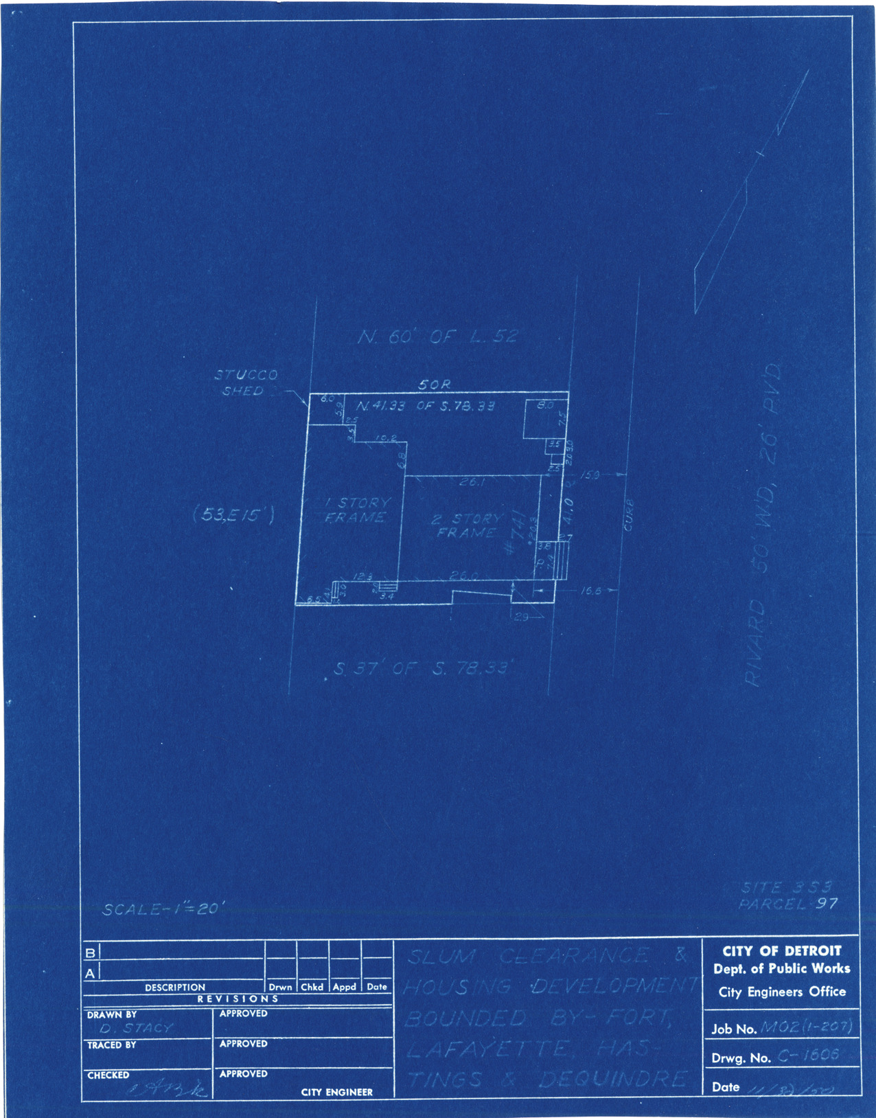 Plot plan for property located on Rivard, parcel 97, site 3-S-3. Recorded on blueprint: "Slum clearance & housing developm't bounded by Fort, Lafayette, Hastings & Dequindre."