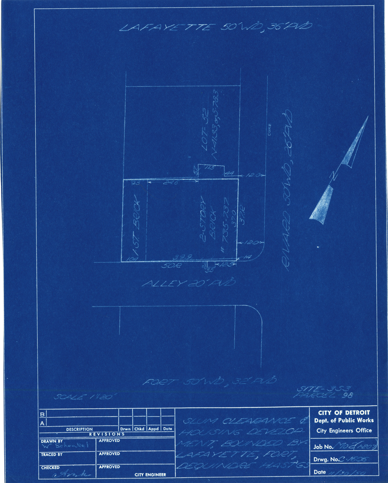 Plot plan for property located on Rivard, parcel 98, site 3-S-3. Recorded on blueprint: "Slum clearance & housing developm't bounded by Lafayette, Fort, Dequindre, Hastings."