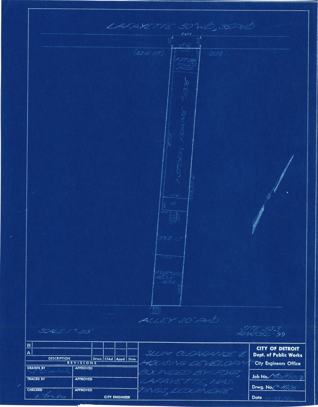 Plot plan for property located on Lafayette, parcel 99, site 3-S-3. Recorded on blueprint: "Slum clearance & housing developm't bounded by Fort, Lafayette, Hastings, Dequindre."