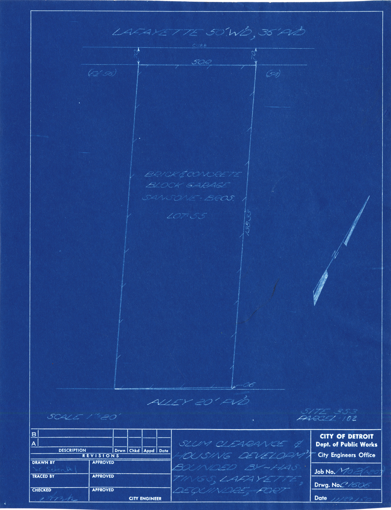 Plot plan for property located on Lafayette, parcel 102, site 3-S-3. Recorded on blueprint: "Sansone Bros." Recorded on blueprint: "Slum clearance & housing developm't bounded by Hastings, Lafayette, Dequindre, Fort."
