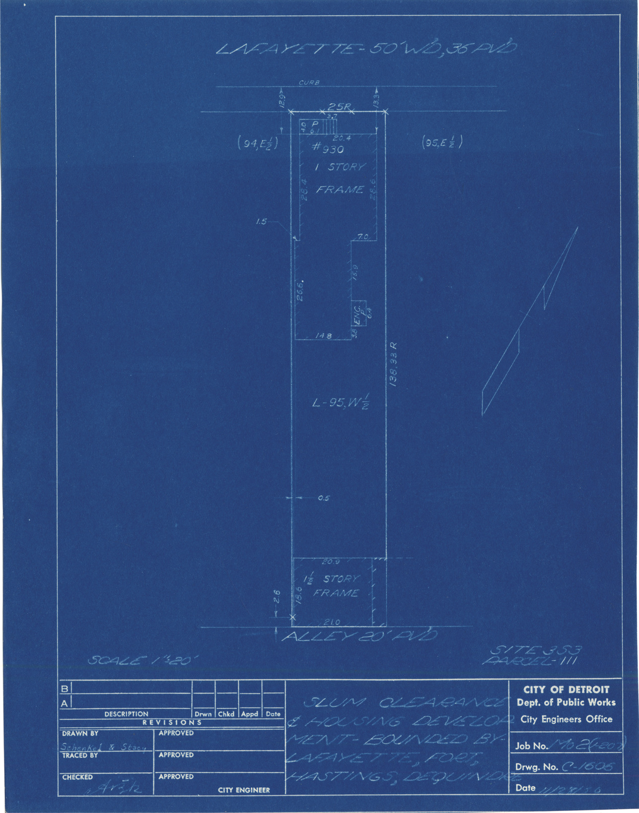 Plot plan for property located on Lafayette, parcel 111, site 3-S-3. Recorded on blueprint: "Slum clearance & housing developm't bounded by Lafayette, Fort, Hastings, Dequindre."