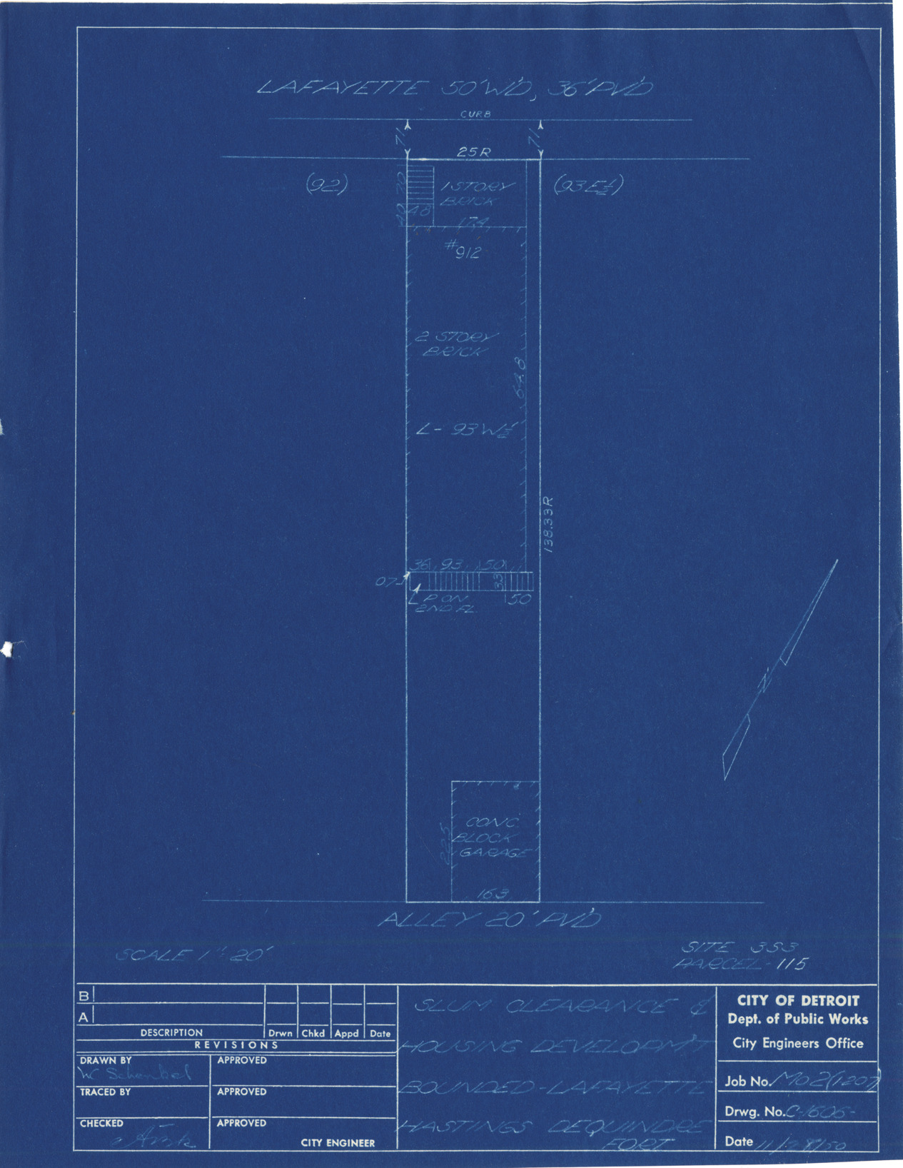 Plot plan for property located on Lafayette, parcel 115, site 3-S-3. Recorded on blueprint: "Slum clearance & housing developm't bounded - Lafayette, Hastings, Dequindre, Fort."