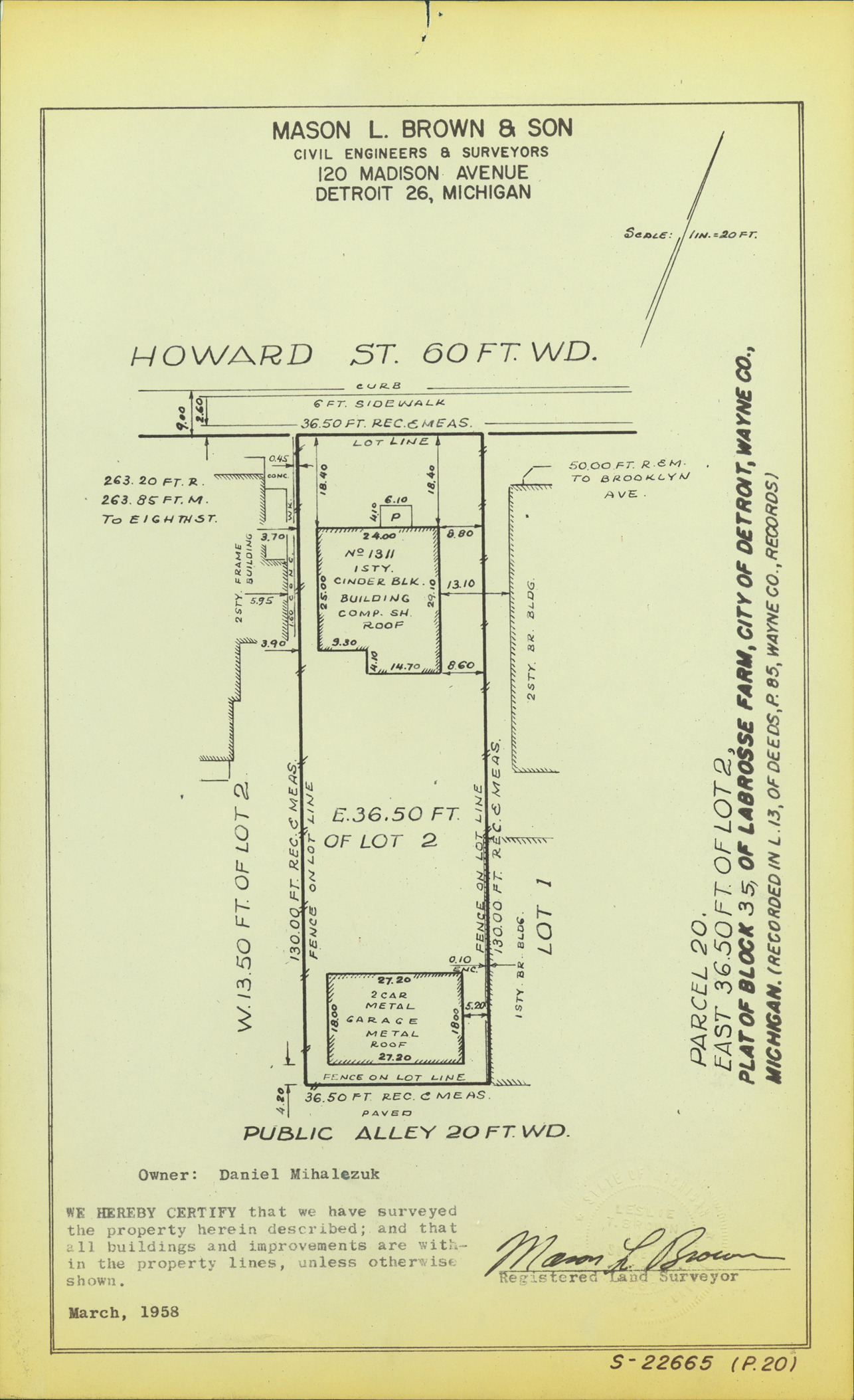 Plat map for property located on Howard, parcel 20, east 36.50 ft. of lot 2. Recorded on map: "Plat of block 35 of Labrosse Farm, city of Detroit, Wayne Co., Michigan. (Recorded in L. 13, of deeds, P. 85, Wayne Co., records.) Mason L. Brown & Son, civil engineers & surveyors, 120 Madison Avenue, Detroit 26, Michigan. We hereby certify that we have surveyed the property herein described; and that all buildings and improvements are within the property lines, unless otherwise shown, [signed] Mason L. Brown, registered land surveyor."