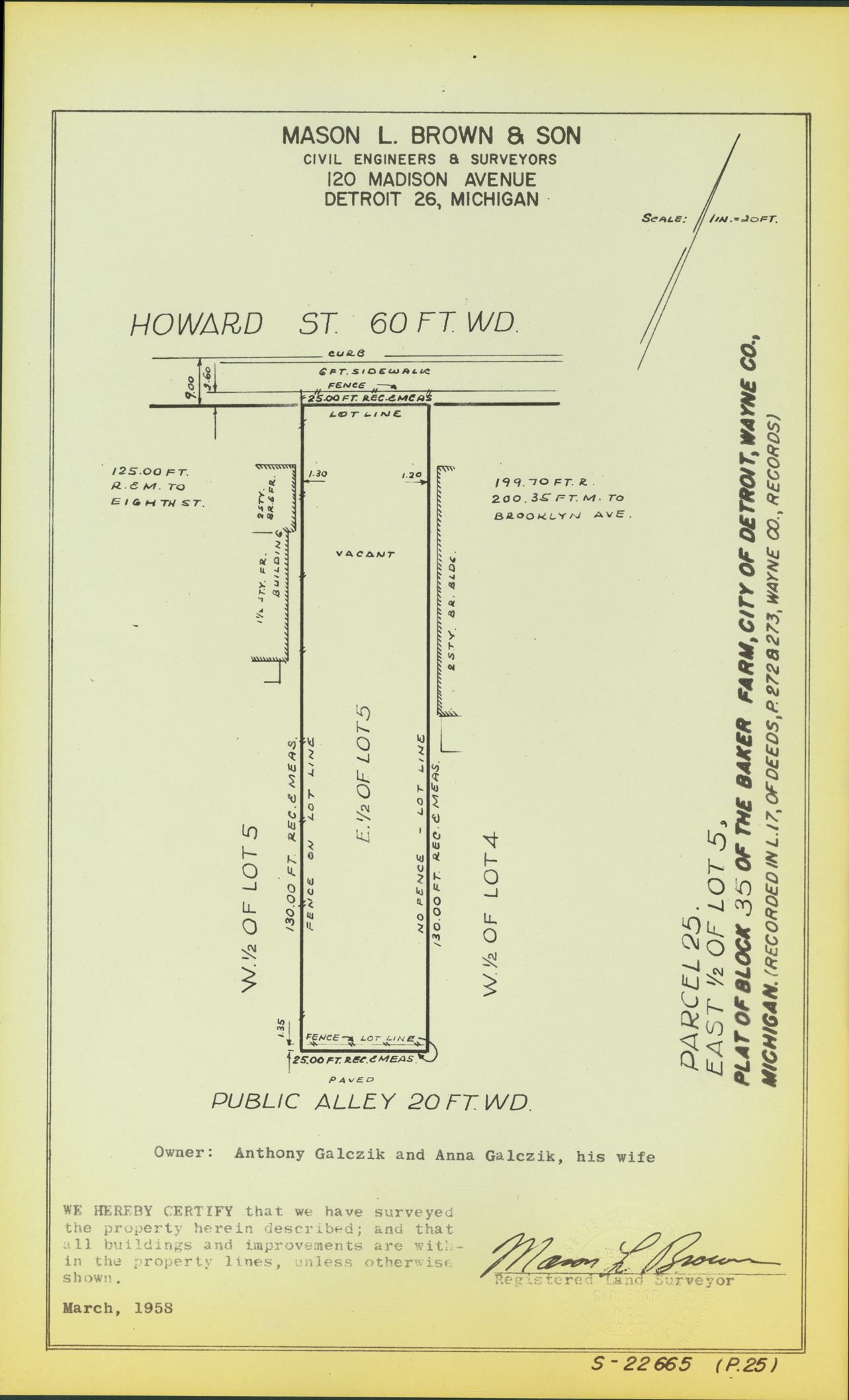 Plat map for property located on Howard, parcel 25, east 1/2 of lot 5. Recorded on map: "Plat of block 35 of the Baker Farm, city of Detroit, Wayne Co., Michigan. (Recorded in L. 17, of deeds, P. 272 & 273, Wayne Co., records.) Mason L. Brown & Son, civil engineers & surveyors, 120 Madison Avenue, Detroit 26, Michigan. We hereby certify that we have surveyed the property herein described; and that all buildings and improvements are within the property lines, unless otherwise shown, [signed] Mason L. Brown, registered land surveyor."