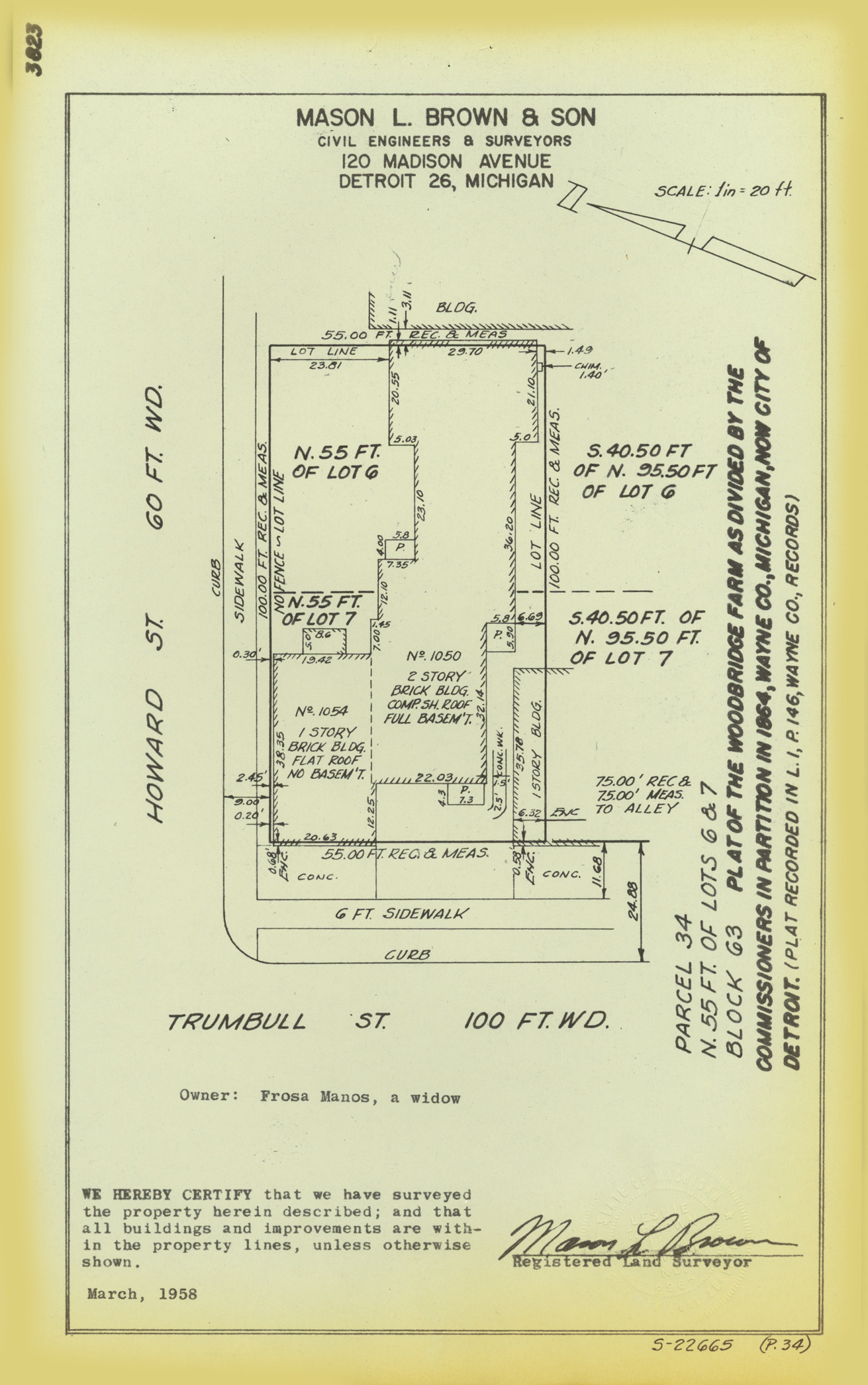 Plat map for property located on the corner of Howard and Trumbull, parcel 34, N. 55 ft. of lots 6 and 7. Recorded on map: "Block 63, plat of the Woodbridge Farm as divided by the Commissioners in partition in 1864, Wayne Co., Michigan, now city of Detroit. (Plat recorded in L. 1, P. 146, Wayne Co., records.) Mason L. Brown & Son, civil engineers & surveyors, 120 Madison Avenue, Detroit 26, Michigan. We hereby certify that we have surveyed the property herein described; and that all buildings and improvements are within the property lines, unless otherwise shown, [signed] Mason L. Brown, registered land surveyor."