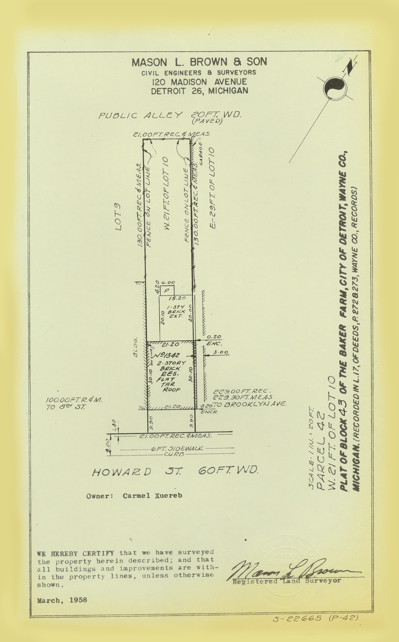 Plat map for property located on Howard, parcel 42, W. 21 ft. of lot 10. Recorded on map: "Plat of block 43, of the Baker Farm, city of Detroit, Wayne Co., Michigan. (Recorded in L. 17, of deeds, P. 272 & 273, Wayne Co., records.) Mason L. Brown & Son, civil engineers & surveyors, 120 Madison Avenue, Detroit 26, Michigan. We hereby certify that we have surveyed the property herein described; and that all buildings and improvements are within the property lines, unless otherwise shown, [signed] Mason L. Brown, registered land surveyor."