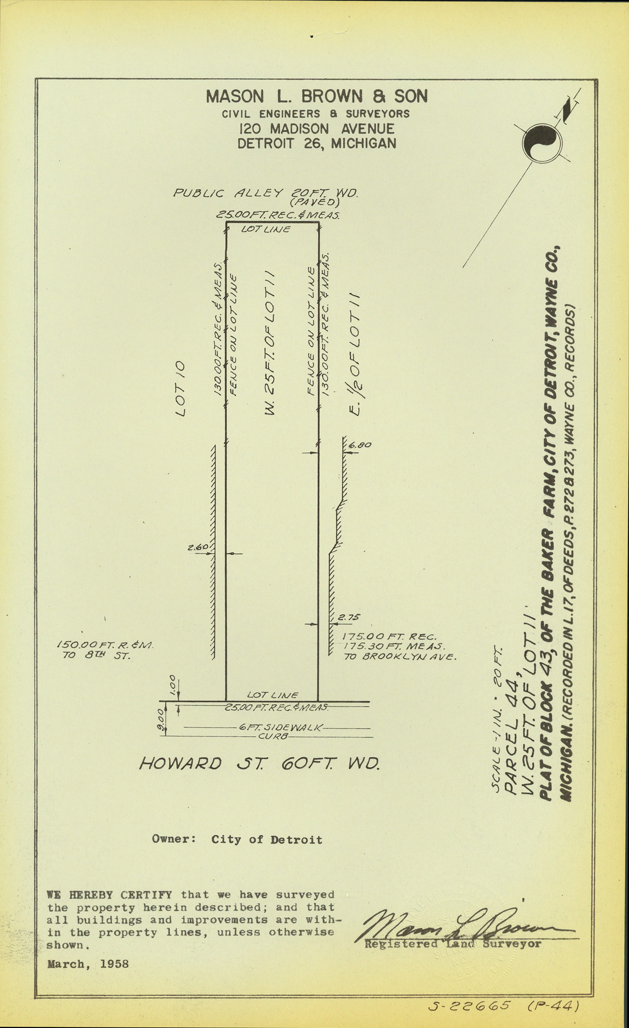 Plat map for property located on Howard, parcel 44, W. 25 ft. of lot 11. Recorded on map: "Plat of block 43, of the Baker Farm, city of Detroit, Wayne Co., Michigan. (Recorded in L. 17, of deeds, P. 272 & 273, Wayne Co., records.) Mason L. Brown & Son, civil engineers & surveyors, 120 Madison Avenue, Detroit 26, Michigan. We hereby certify that we have surveyed the property herein described; and that all buildings and improvements are within the property lines, unless otherwise shown, [signed] Mason L. Brown, registered land surveyor."