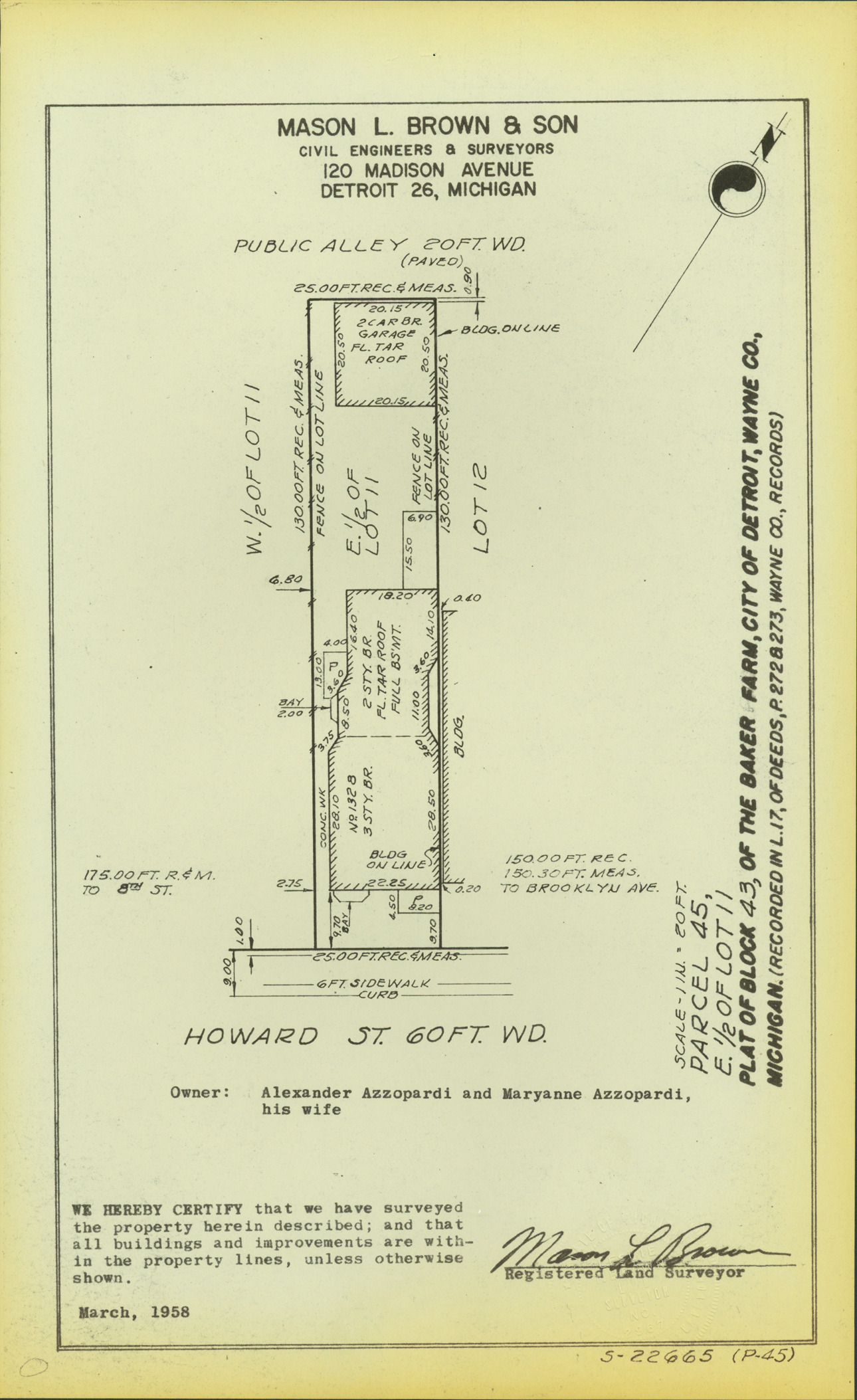 Plat map for property located on Howard, parcel 45, E. 1/2 of lot 11. Recorded on map: "Plat of block 43, of the Baker Farm, city of Detroit, Wayne Co., Michigan. (Recorded in L. 17, of deeds, P. 272 & 273, Wayne Co., records.) Mason L. Brown & Son, civil engineers & surveyors, 120 Madison Avenue, Detroit 26, Michigan. We hereby certify that we have surveyed the property herein described; and that all buildings and improvements are within the property lines, unless otherwise shown, [signed] Mason L. Brown, registered land surveyor."