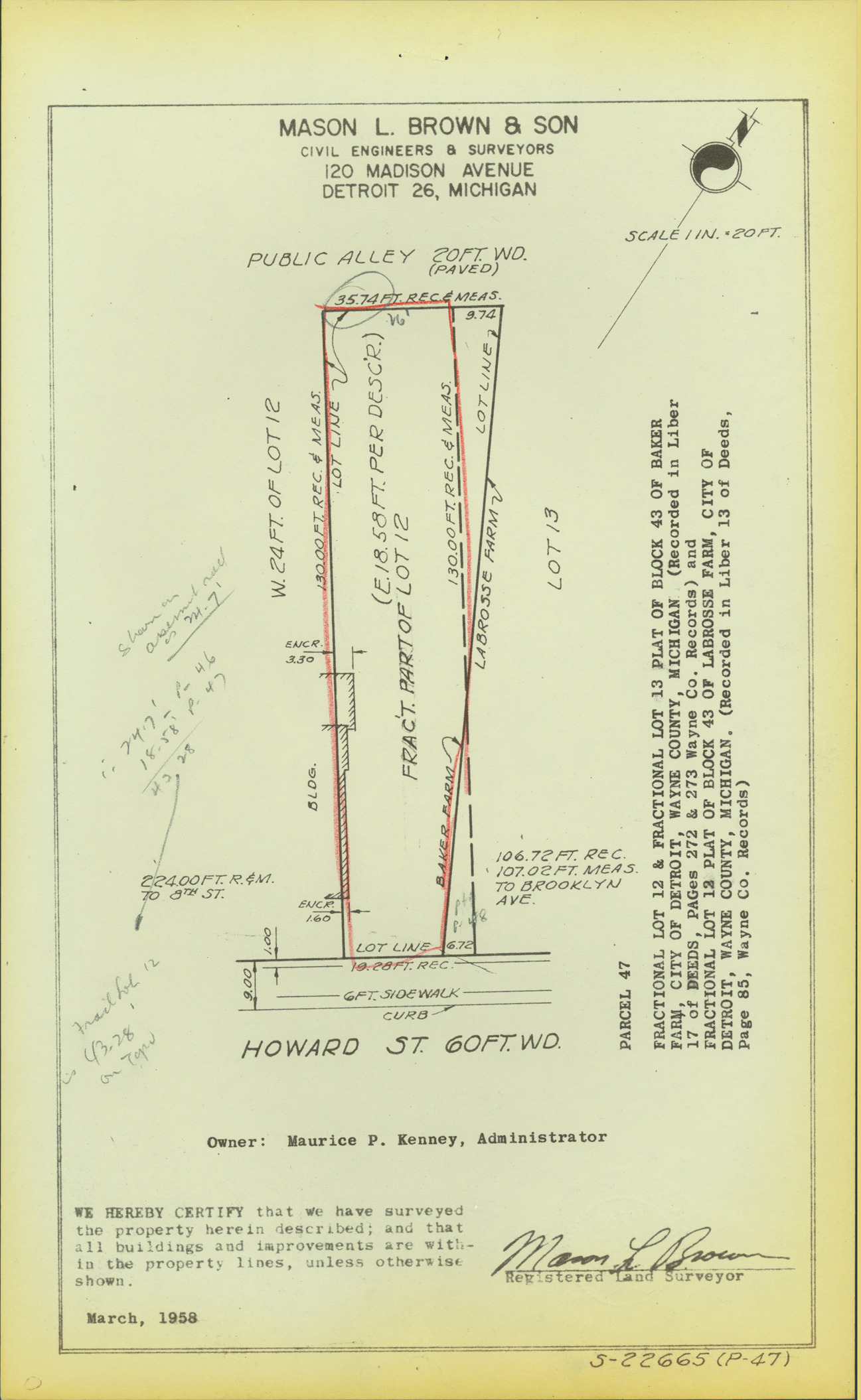 Plat map for property located on Howard, parcel 47. Recorded on map: "Fractional lot 12 & fractional lot 13, plat of block 43 of Baker Farm, city of Detroit, Wayne County, Michigan. (Recorded in Liber 17 of deeds, pages 272 & 273, Wayne Co. records.) Fractional lot 12 plat of block 43 of Labrosse Farm, city of Detroit, Wayne County, Michigan. (Recorded in Liber 13 of deeds, page 85, Wayne Co. records.) Mason L. Brown & Son, civil engineers & surveyors, 120 Madison Avenue, Detroit 26, Michigan. We hereby certify that we have surveyed the property herein described; and that all buildings and improvements are within the property lines, unless otherwise shown, [signed] Mason L. Brown, registered land surveyor."