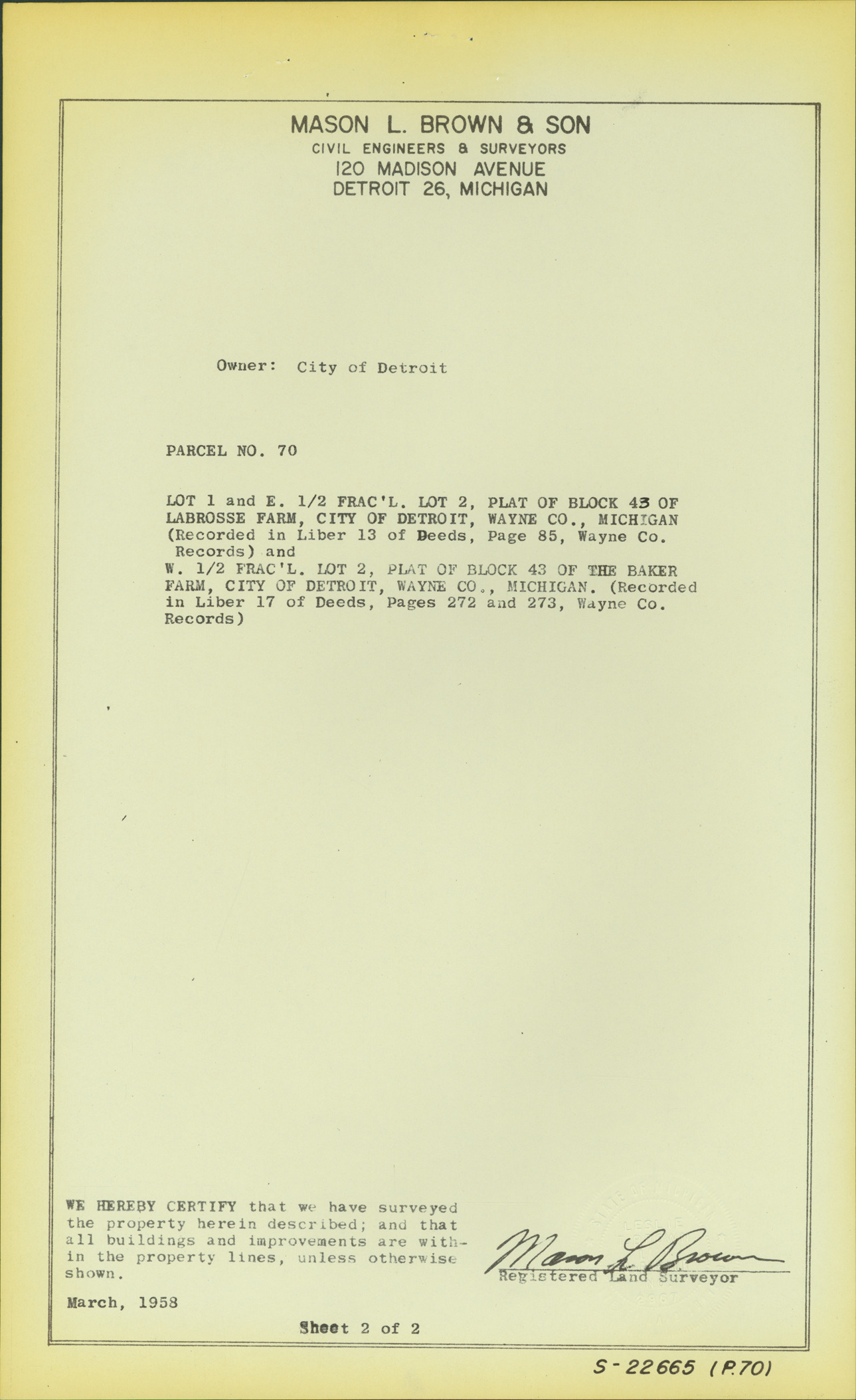 Second page of plat map for property located on the corner of Brooklyn and Abbott, parcel 70. Recorded on map: "Lot 1 and E. 1/2 frac'l, lot 2, plat of block 43 of Labrosse Farm, city of Detroit, Wayne Co., Michigan. (Recorded in Liber 13 of deeds, page 85, Wayne Co. records) and W. 1/2 frac'l, lot 2, plat of block 43 of the Baker Farm, city of Detroit, Wayne Co., Michigan. (Recorded in Liber 17 of deeds, pages 272 and 273, Wayne Co. records.) Mason L. Brown & Son, civil engineers & surveyors, 120 Madison Avenue, Detroit 26, Michigan. We hereby certify that we have surveyed the property herein described; and that all buildings and improvements are within the property lines, unless otherwise shown, [signed] Mason L. Brown, registered land surveyor, sheet 2 of 2."