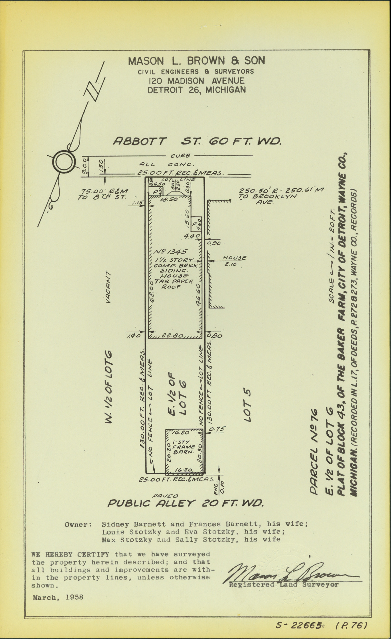 Plat map for property located on Abbott, parcel 76, E. 1/2 of lot 6. Recorded on map: "Plat of block 43 of the Baker Farm, city of Detroit, Wayne Co., Michigan. (Recorded in L. 17 of deeds, P. 272 & 273, Wayne Co., records.) Mason L. Brown & Son, civil engineers & surveyors, 120 Madison Avenue, Detroit 26, Michigan. We hereby certify that we have surveyed the property herein described; and that all buildings and improvements are within the property lines, unless otherwise shown, [signed] Mason L. Brown, registered land surveyor."
