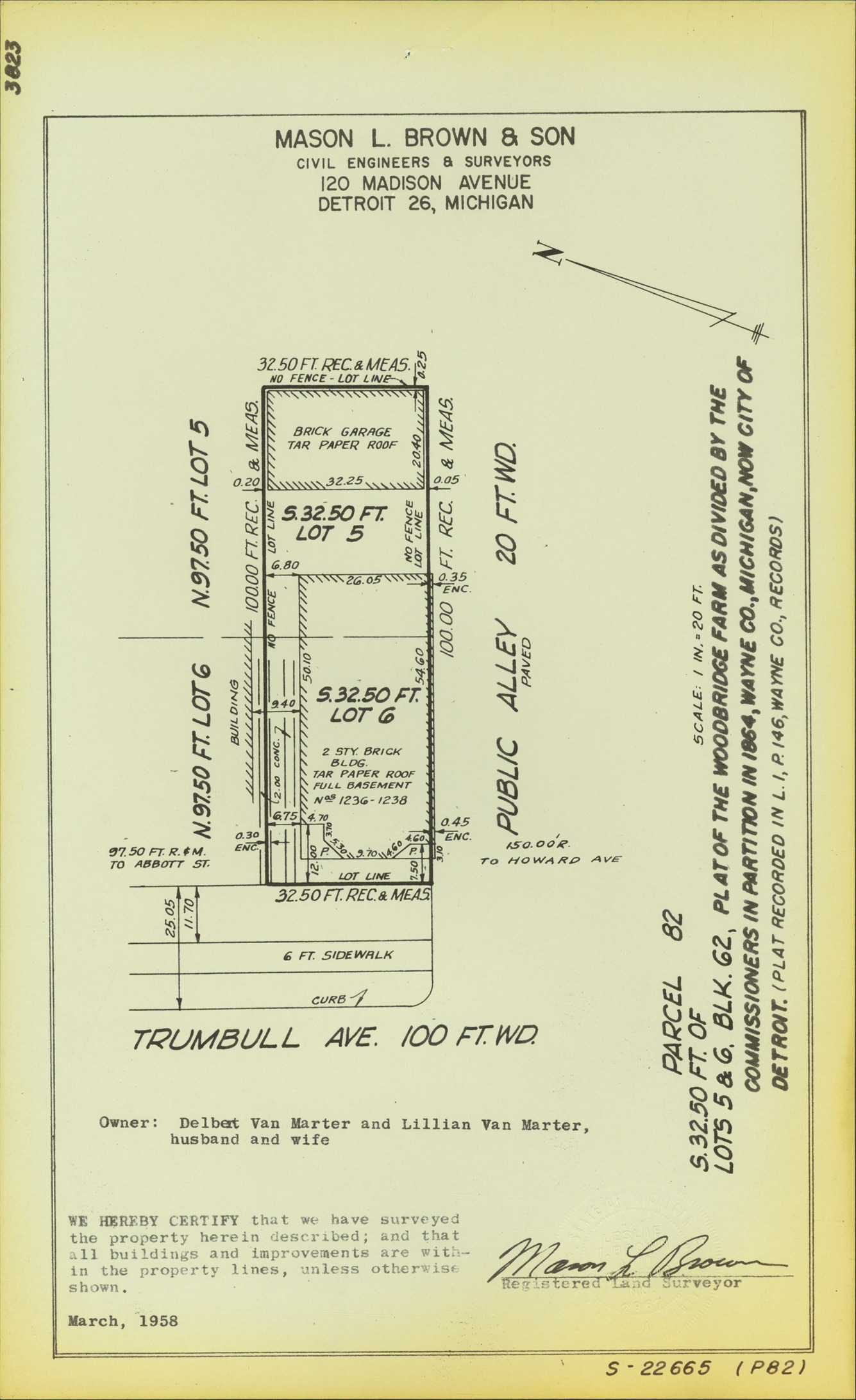 Plat map for property located on Trumbull, parcel 82, S. 32.50 ft. of lots 5 and 6. Recorded on map: "Blk. 62, plat of the Woodbridge Farm as divided by the Commissioners in partition in 1864, Wayne Co., Michigan, now city of Detroit. (Plat recorded in L. 1, P. 146, Wayne Co., records.) Mason L. Brown & Son, civil engineers & surveyors, 120 Madison Avenue, Detroit 26, Michigan. We hereby certify that we have surveyed the property herein described; and that all buildings and improvements are within the property lines, unless otherwise shown, [signed] Mason L. Brown, registered land surveyor."
