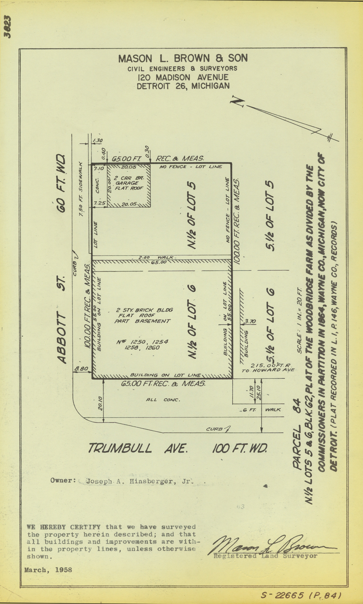 Plat map for property located on the corner of Trumbull and Abbott, parcel 84, N. 1/2 lots 5 and 6. Recorded on map: "Blk. 62, plat of the Woodbridge Farm as divided by the Commissioners in partition in 1864, Wayne Co., Michigan, now city of Detroit. (Plat recorded in L. 1, P. 146, Wayne Co., records.) Mason L. Brown & Son, civil engineers & surveyors, 120 Madison Avenue, Detroit 26, Michigan. We hereby certify that we have surveyed the property herein described; and that all buildings and improvements are within the property lines, unless otherwise shown, [signed] Mason L. Brown, registered land surveyor."