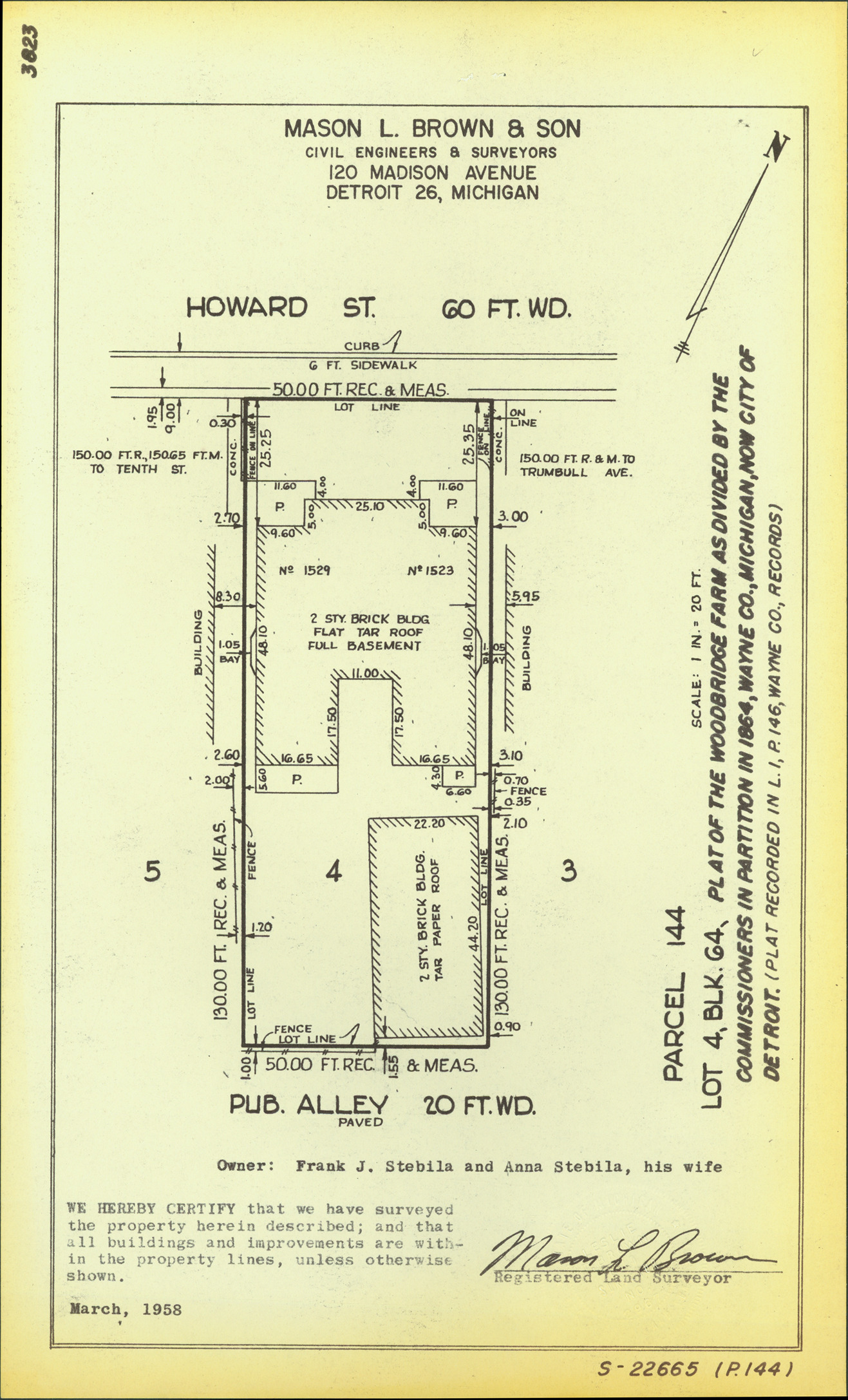 Plat map for property located on Howard, parcel 144, lot 4. Recorded on map: "Blk. 64, plat of the Woodbridge Farm as divided by the Commissioners in partition in 1864, Wayne Co., Michigan, now city of Detroit. (Plat recorded in L. 1, P. 146, Wayne Co., records.) Mason L. Brown & Son, civil engineers & surveyors, 120 Madison Avenue, Detroit 26, Michigan. We hereby certify that we have surveyed the property herein described; and that all buildings and improvements are within the property lines, unless otherwise shown, [signed] Mason L. Brown, registered land surveyor."