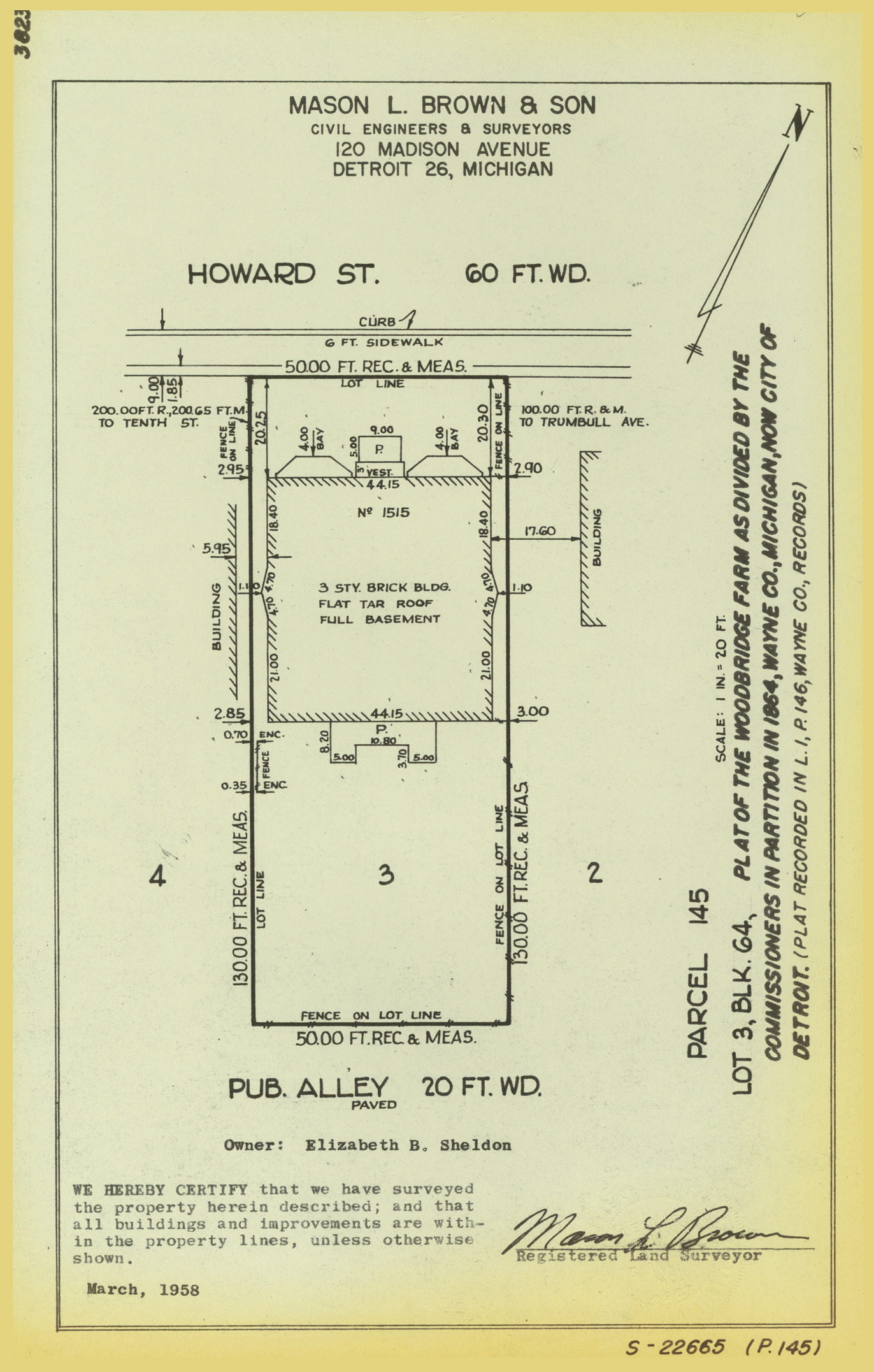 Plat map for property located on Howard, parcel 145, lot 3. Recorded on map: "Blk. 64, plat of the Woodbridge Farm as divided by the Commissioners in partition in 1864, Wayne Co., Michigan, now city of Detroit. (Plat recorded in L. 1, P. 146, Wayne Co., records.) Mason L. Brown & Son, civil engineers & surveyors, 120 Madison Avenue, Detroit 26, Michigan. We hereby certify that we have surveyed the property herein described; and that all buildings and improvements are within the property lines, unless otherwise shown, [signed] Mason L. Brown, registered land surveyor."