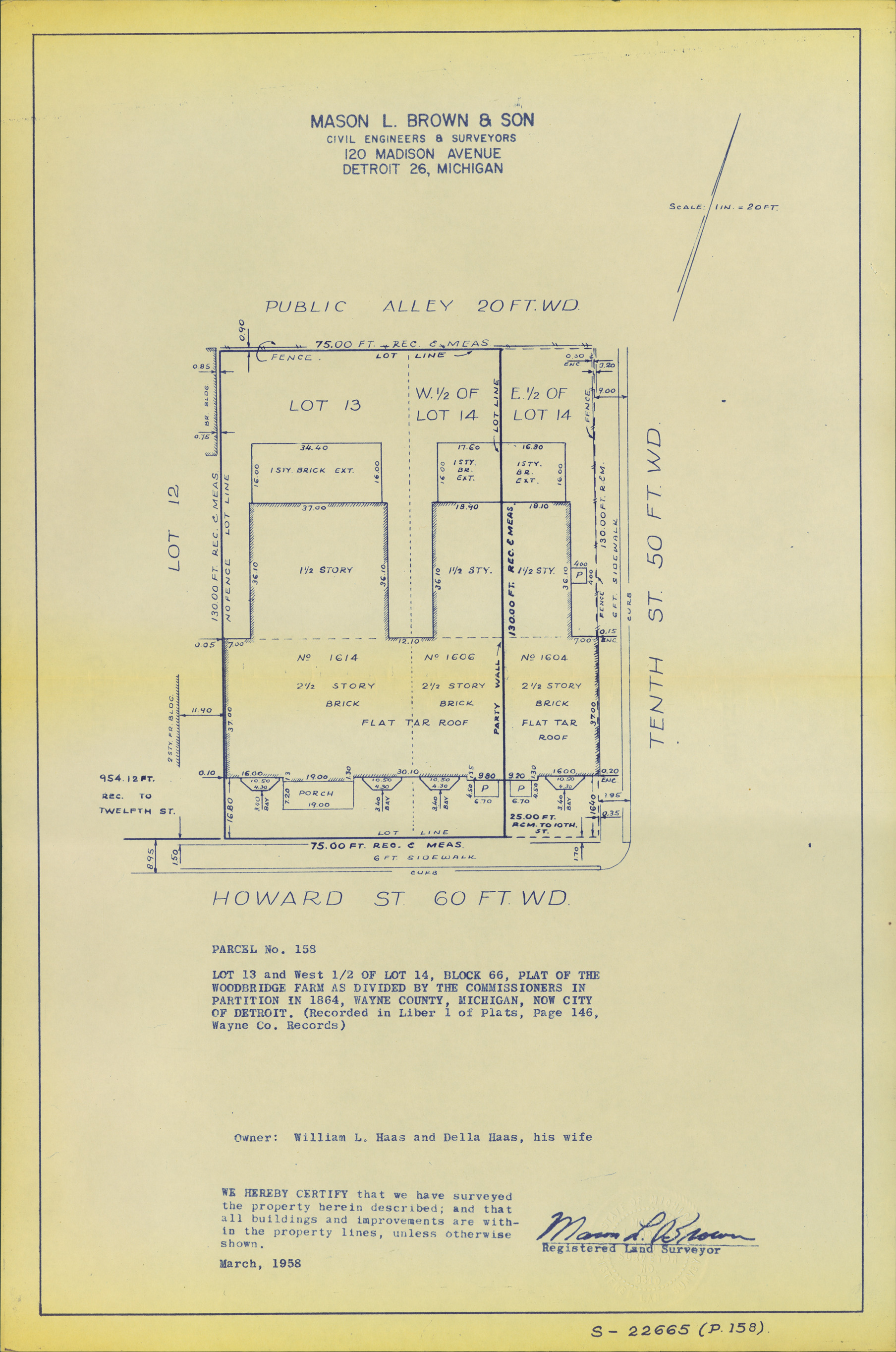 Plat map for property located on the corner of Howard and 10th St., parcel 158. Recorded on map: "Lot 13 and west 1/2 of lot 14, block 66, plat of the Woodbridge Farm as divided by the Commissioners in partition in 1864, Wayne County, Michigan, now city of Detroit. (Recorded in Liber 1 of plats, page 146, Wayne Co. records.) Mason L. Brown & Son, civil engineers & surveyors, 120 Madison Avenue, Detroit 26, Michigan. We hereby certify that we have surveyed the property herein described; and that all buildings and improvements are within the property lines, unless otherwise shown, [signed] Mason L. Brown, registered land surveyor."