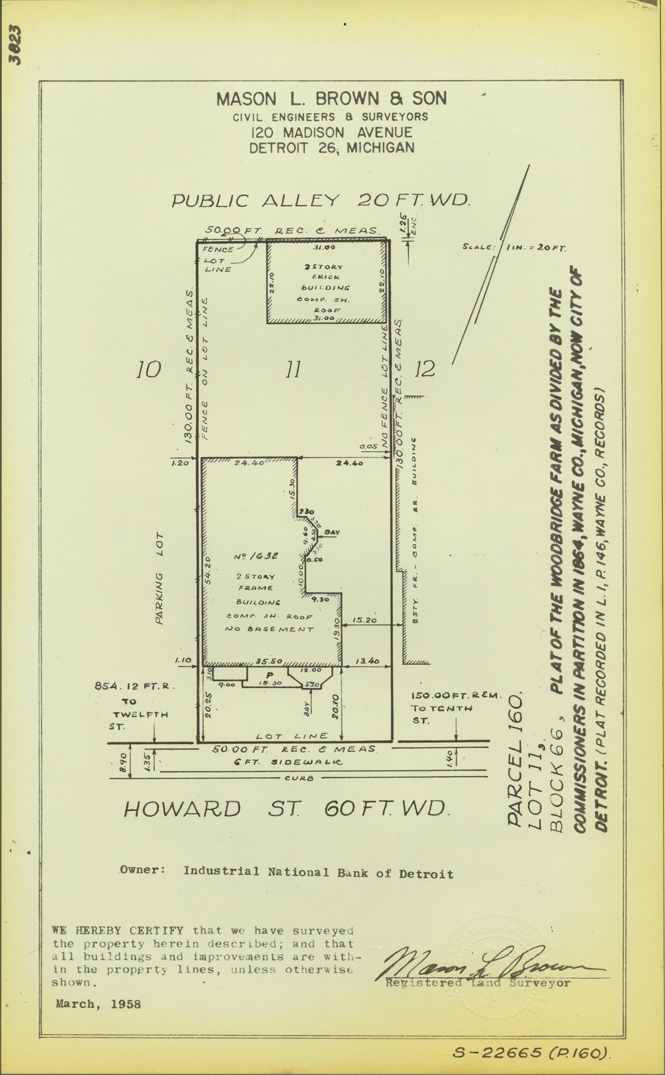 Plat map for property located on Howard, parcel 160, lot 11. Recorded on map: "Block 66, plat of the Woodbridge Farm as divided by the Commissioners in partition in 1864, Wayne Co., Michigan, now city of Detroit. (Plat recorded in L. 1, P. 146, Wayne Co. records.) Mason L. Brown & Son, civil engineers & surveyors, 120 Madison Avenue, Detroit 26, Michigan. We hereby certify that we have surveyed the property herein described; and that all buildings and improvements are within the property lines, unless otherwise shown, [signed] Mason L. Brown, registered land surveyor."