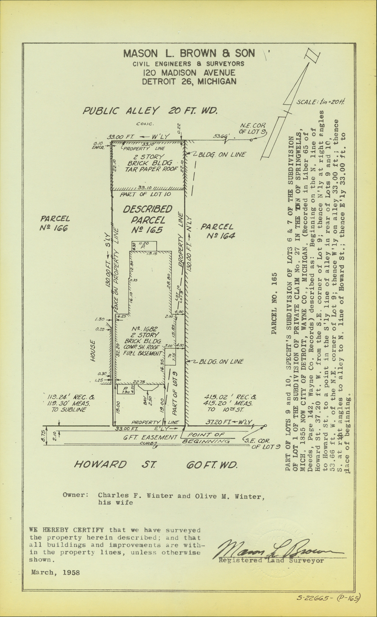Plat map for property located on Howard, parcel 165. Recorded on map: "Part of lots 9 and 10, Specth's subdivision of lots 6 and 7 of the subdivision of lot 1 of the subdivision of private claim no. 27 in the town of Springwells, Mich. 1855 now city of Detroit, Wayne Co., Michigan. (Recorded in Liber 65 of deeds, page 142, Wayne Co. records) described as: Beginning on the N. line of Howard St. 37.20 ft. W. from the S.E. corner of lot 9; thence N'ly at right angles to Howard St. to a point in the S'ly line of alley in rear of lots 9 and 10, 53.66 ft. W. of the N.E. corner of lot 9; thence W'ly on alley 33.00 ft.; thence S. at right angles to alley to N. line of Howard St.; thence E'ly 33.00 ft. to place of beginning. Mason L. Brown & Son, civil engineers & surveyors, 120 Madison Avenue, Detroit 26, Michigan. We hereby certify that we have surveyed the property herein described; and that all buildings and improvements are within the property lines, unless otherwise shown, [signed] Mason L. Brown, registered land surveyor."