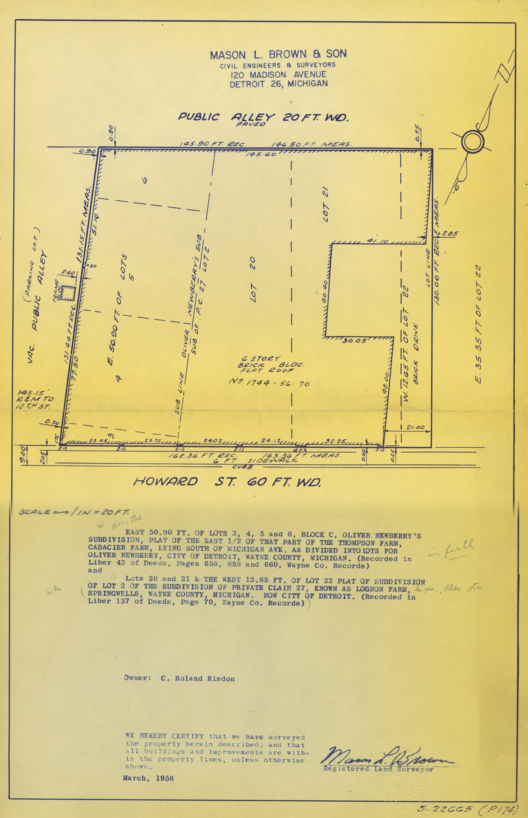 Plat map for property located on Howard. Recorded on map: "East 50.90 ft. of lots 3, 4, 5 and 6, block C, Oliver Newberry's subdivision, plat of the east 1/2 of that part of the Thompson Farm, Cabacier Farm, lying south of Michigan Ave. as divided into lots for Oliver Newberry, city of Detroit, Wayne County, Michigan. (Recorded in Liber 43 of deeds, pages 658, 659 and 660, Wayne Co. records.) Lots 20 and 21 & the west 12.65 ft. of lot 22 plat of subdivision of lot 2 of the subdivision of private claim 27, known as Lognon Farm, Springwells, Wayne County, Michigan. Now city of Detroit. (Recorded in Liber 137 of deeds, page 70, Wayne Co. records.) Mason L. Brown & Son, civil engineers & surveyors, 120 Madison Avenue, Detroit 26, Michigan. We hereby certify that we have surveyed the property herein described; and that all buildings and improvements are within the property lines, unless otherwise shown, [signed] Mason L. Brown, registered land surveyor."