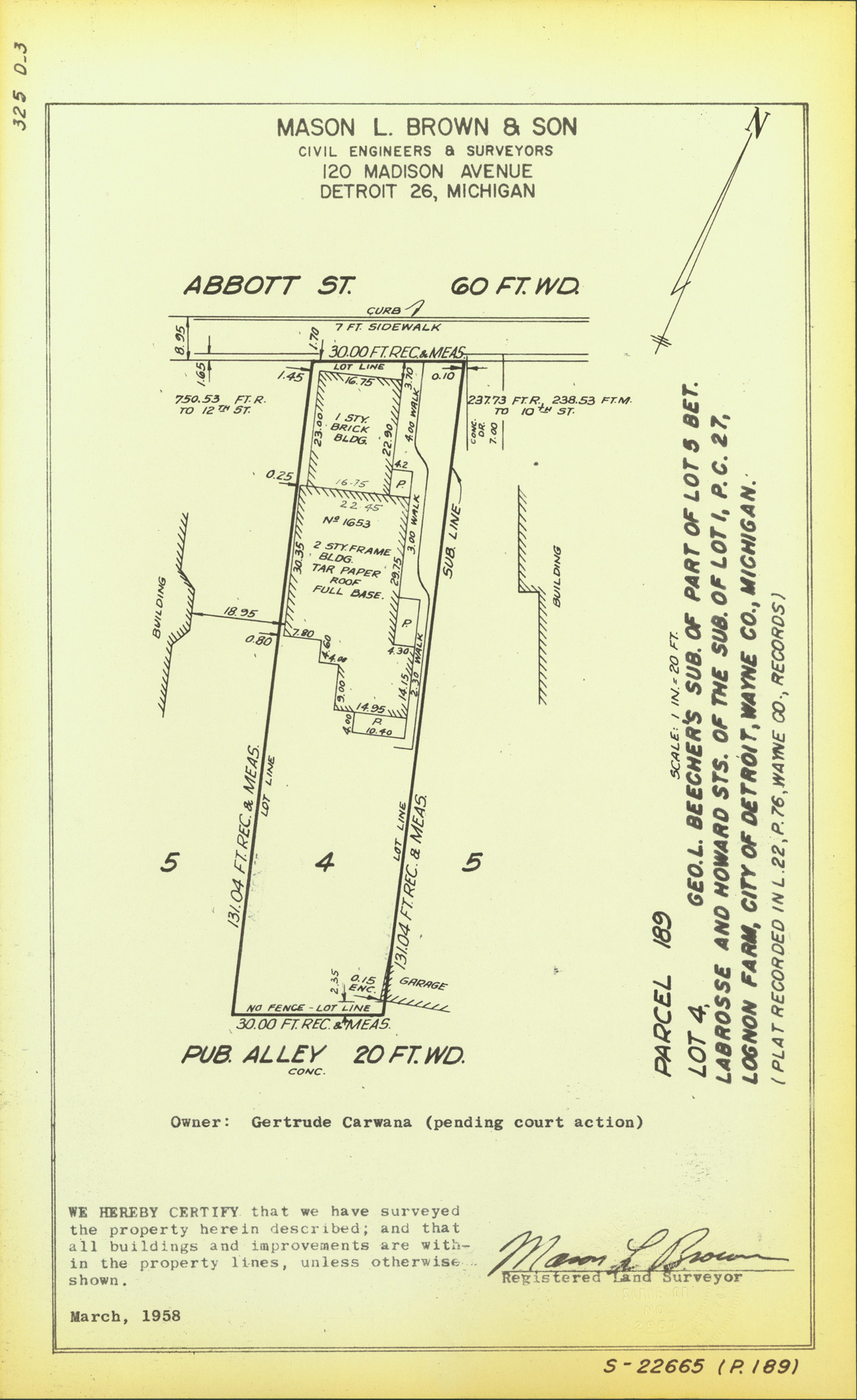 Plat map for property located on Abbott, parcel 189, lot 4. Recorded on map: "Geo. L. Beecher's sub. of part of lot 5 bet. Labrosse and Howard Sts. of the sub. of lot 1, P.C. 27, Lognon Farm, city of Detroit, Wayne Co., Michigan. (Plat recorded in L. 22, P. 76, Wayne Co., records.) Mason L. Brown & Son, civil engineers & surveyors, 120 Madison Avenue, Detroit 26, Michigan. We hereby certify that we have surveyed the property herein described; and that all buildings and improvements are within the property lines, unless otherwise shown, [signed] Mason L. Brown, registered land surveyor."