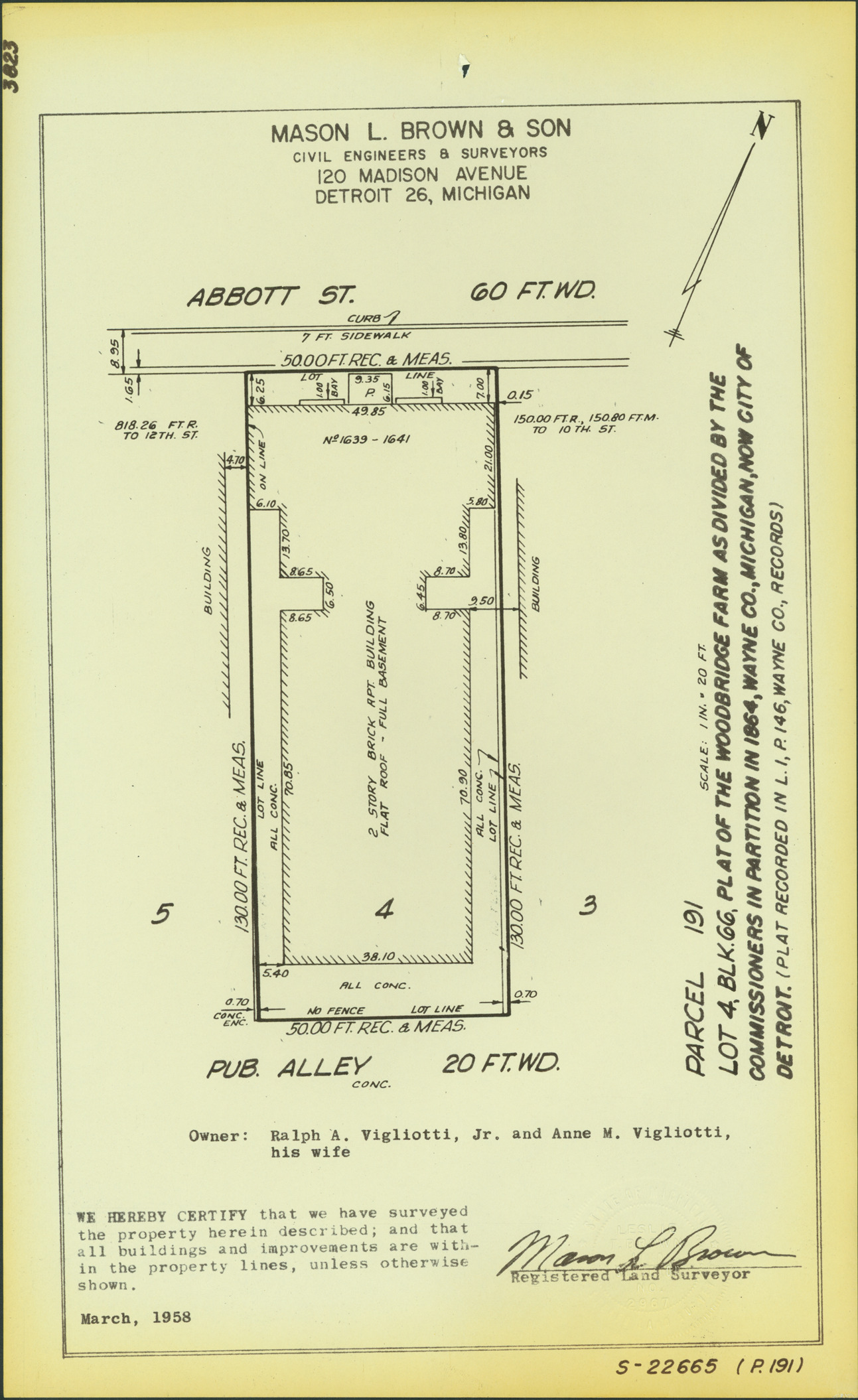 Plat map for property located on Abbott, parcel 191, lot 4. Recorded on map: "Blk. 66, plat of the Woodbridge Farm as divided by the Commissioners in partition in 1864, Wayne Co., Michigan, now city of Detroit. (Plat recorded in L. 1, P. 146, Wayne Co., records.) Mason L. Brown & Son, civil engineers & surveyors, 120 Madison Avenue, Detroit 26, Michigan. We hereby certify that we have surveyed the property herein described; and that all buildings and improvements are within the property lines, unless otherwise shown, [signed] Mason L. Brown, registered land surveyor."