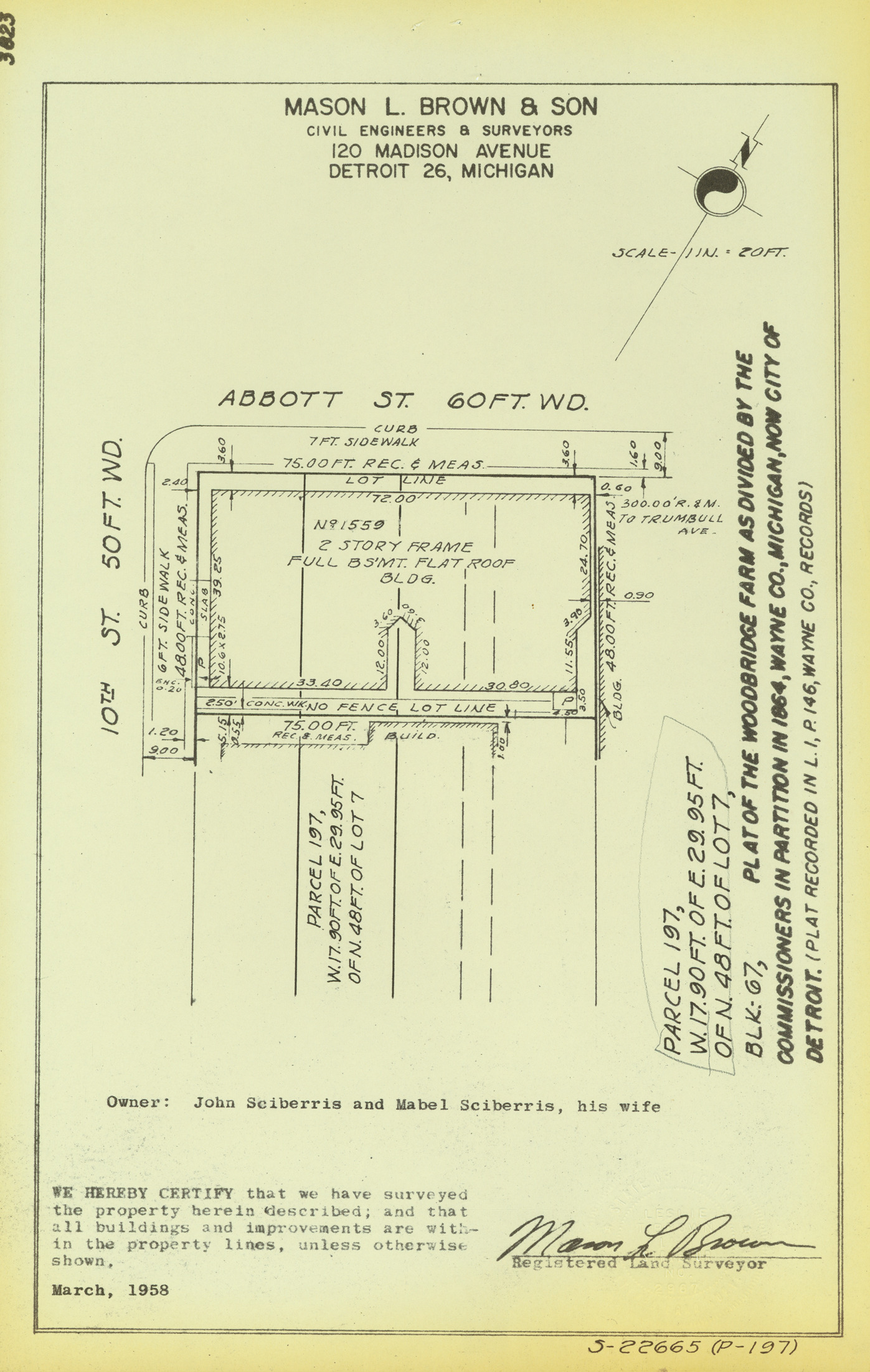 Plat map for property located on the corner of Abbott and 10th St., parcel 197, W. 17.90 ft. of E. 29.95 ft. of N. 48 ft. of lot 7. Recorded on map: "Blk. 67, plat of the Woodbridge Farm as divided by the Commissioners in partition in 1864, Wayne Co., Michigan, now city of Detroit. (Plat recorded in L. 1, P. 146, Wayne Co., records.) Mason L. Brown & Son, civil engineers & surveyors, 120 Madison Avenue, Detroit 26, Michigan. We hereby certify that we have surveyed the property herein described; and that all buildings and improvements are within the property lines, unless otherwise shown, [signed] Mason L. Brown, registered land surveyor."