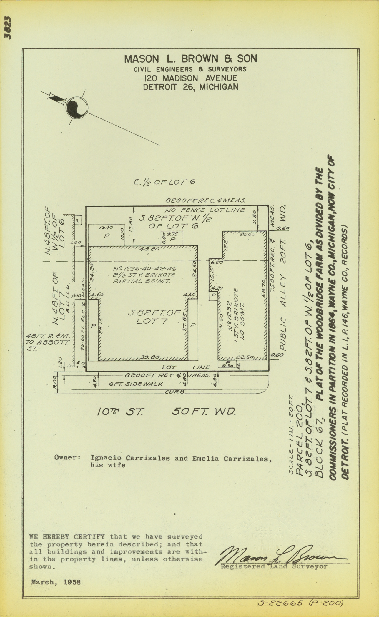 Plat map for property located on 10th St., parcel 200, S. 82 ft. of lot 7 and S. 82 ft. of W. 1/2 of lot 6. Recorded on map: "Block 67, plat of the Woodbridge Farm as divided by the Commissioners in partition in 1864, Wayne Co., Michigan, now city of Detroit. (Plat recorded in L. 1, P. 146, Wayne Co., records.) Mason L. Brown & Son, civil engineers & surveyors, 120 Madison Avenue, Detroit 26, Michigan. We hereby certify that we have surveyed the property herein described; and that all buildings and improvements are within the property lines, unless otherwise shown, [signed] Mason L. Brown, registered land surveyor."