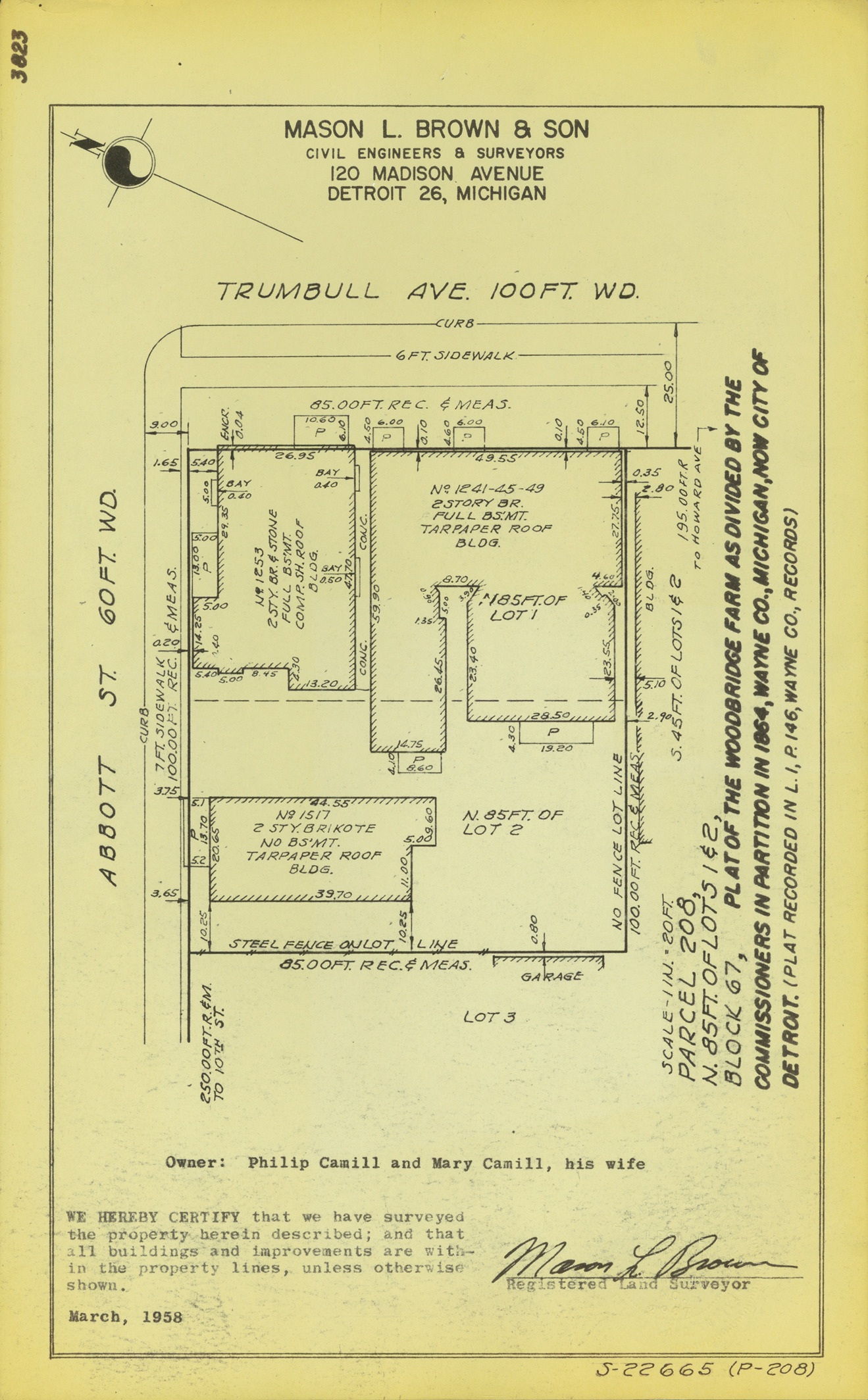 Plat map for property located on the corner of Abbott and Trumbull, parcel 208, N. 85 ft. of lots and 2. Recorded on map: "Block 67, plat of the Woodbridge Farm as divided by the Commissioners in partition in 1864, Wayne Co., Michigan, now city of Detroit. (Plat recorded in L. 1, P. 146, Wayne Co., records.) Mason L. Brown & Son, civil engineers & surveyors, 120 Madison Avenue, Detroit 26, Michigan. We hereby certify that we have surveyed the property herein described; and that all buildings and improvements are within the property lines, unless otherwise shown, [signed] Mason L. Brown, registered land surveyor."
