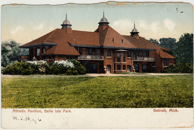 View of athletic pavilion on Belle Isle; two-story brick building has three cupolas on roof; lawn in foreground. Printed on front: "Athletic pavilion, Belle Isle Park. Detroit, Mich." Printed on back: "A6091, published by the Detroit News Company, Detroit, Mich., Leipzig, Dresden." American News Co. publisher trademark printed on back. Handwritten on back: "N.J.W. 1/11/07."