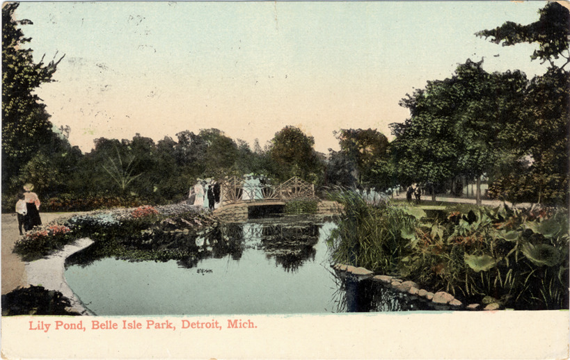 View of landscaped pond with water lilies and reeds on Belle Isle; men and women stand on rustic bridge over pond in background. Printed on front: "Lily pond, Belle Isle Park, Detroit, Mich." Printed on back: "Published by S.H. Knox & Co., Detroit, Mich." Handwritten on back: "2/22/09. Well this has been a fine day, just like spring. I went to see A.G. Field's minstrals this afternoon and the show was fine. I have "I love a laisse" for the piano and I will send it to you tomorrow. E.A.S." Card is postmarked February 22, 1909.