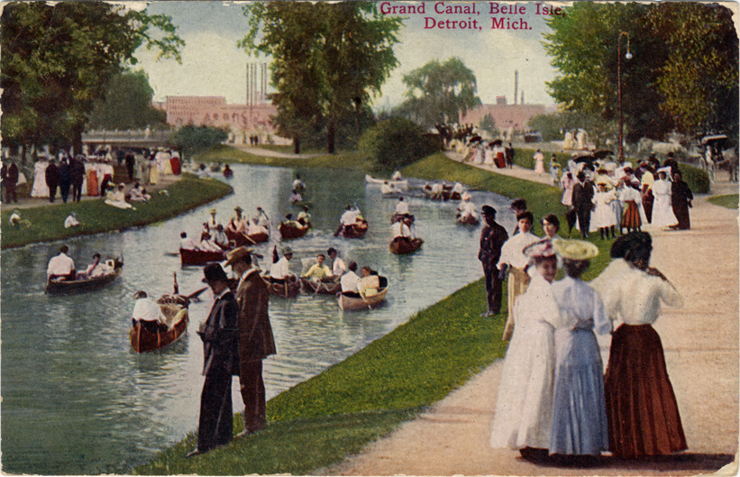 View of canoeists on Belle Isle canal; onlookers watch from banks. Three women walk on sidewalk in foreground; factory buildings in distance. Printed on front: "Grand Canal, Belle Isle, Detroit, Mich." Printed on back: "Grand Canal, Belle Isle. Canoeing is the leading sport at Belle Isle, Detroit's largest play-ground. Its 702 acres are threaded by many miles of canals and lakes, affording an ideal spot in which the light little craft cruise about by thousands. Band concerts are given at the city's expense during the summer afternoons and evenings and on such occasions the canoeists are present in great numbers." Handwritten on back: "7/21. Rec'd your letter. Also have had one from Bessie. I will meet you & Uncle Chas. Sunday. Are you coming ... or Lake Shore & what time will you leave Saline. Would like to know so there will be no mistake. Drop me a line. J.W.S." Card is postmarked July 21, 1910.