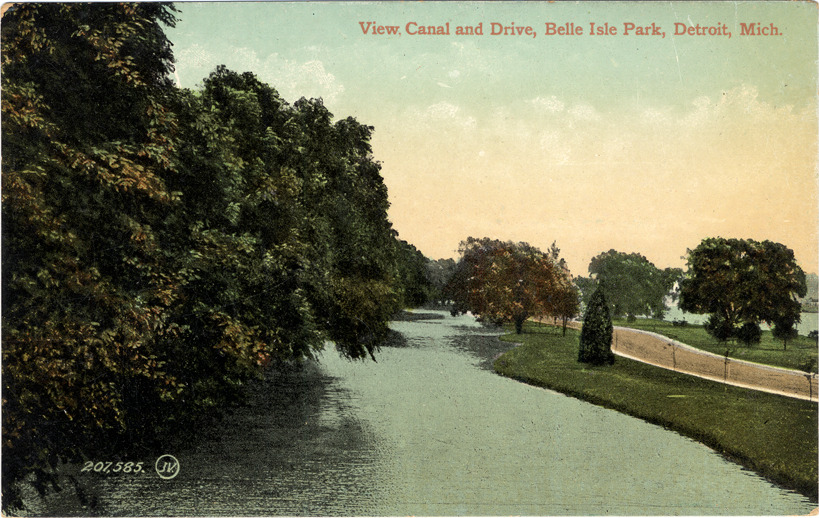 View of canal on Belle Isle. Banks are lined with trees; road is adjacent to canal. Printed on front: "View, canal and drive, Belle Isle Park, Detroit, Mich., 207,585." Printed on back: "Published by S.H. Knox & Co., Detroit, Mich. Printed in Great Britain." Handwritten on back in upper right corner: "3/19/09."