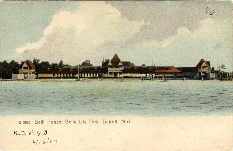 Favorite this☆ Bathhouse on Belle Isle Description: View of bathhouse on Belle Isle from across water. Printed on front: "G3882, Bath house, Belle Isle Park, Detroit, Mich." Handwritten on front: "N.J.W. 83, 2/16/07." Printed on back: "The Rotograph Co., N.Y. city, (Germany)." Details Resource ID: bh004506 Subject: Belle Isle Park (Detroit, Mich.) Bathhouses--Michigan--Detroit Postcards Publisher: Rotograph Co. Date Issued: Unknown year Format: 1 postcard : col. ; 3.5 x 5.5 in. Member of: Burton Historical Collection Filing Location: D/Parks-Belle Isle-Bath House Rights: Physical rights are retained by DPL. Copyright is retained in accordance with U.S. copyright laws.