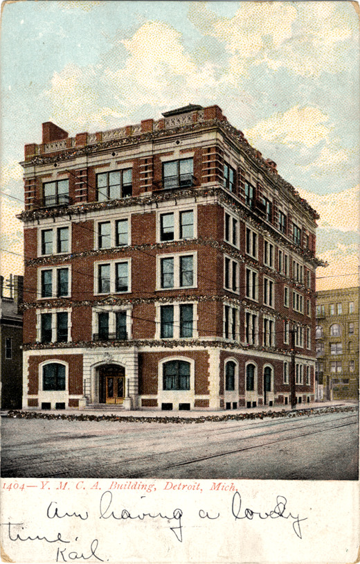 Front and side view of Y.M.C.A. building; multistory brick and stone building has balustrade on roof. Glitter glued on postcard outlines sidewalk and each story of building. Printed on front: "1404, Y.M.C.A. building, Detroit, Mich." Handwritten on front: "Am having a lovely time. Karl." Printed on back: "Souvenir Post Card Co., New York and Berlin." Card is postmarked July 5, 1906.