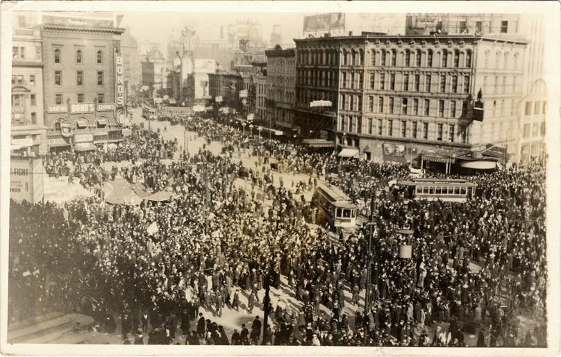 Favorite this☆ Detroit Peace Parade Description: Aerial view of Detroit Peace Parade in 1918. Crowds gather in street; two streetcars in middle of crowd; commercial buildings in background. Details Resource ID: bh004532 Subject: Parades--Michigan--Detroit Crowds--Michigan--Detroit Commercial buildings--Michigan--Detroit Photographic prints Postcards Date Issued: 1918 Format: 1 postcard ; 3.5 x 5.5 in. Member of: Burton Historical Collection Filing Location: D/Parades-Detroit Peace Parade 1918 Rights: Physical rights are retained by DPL. Copyright is retained in accordance with U.S. copyright laws.